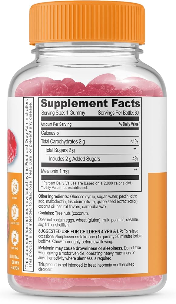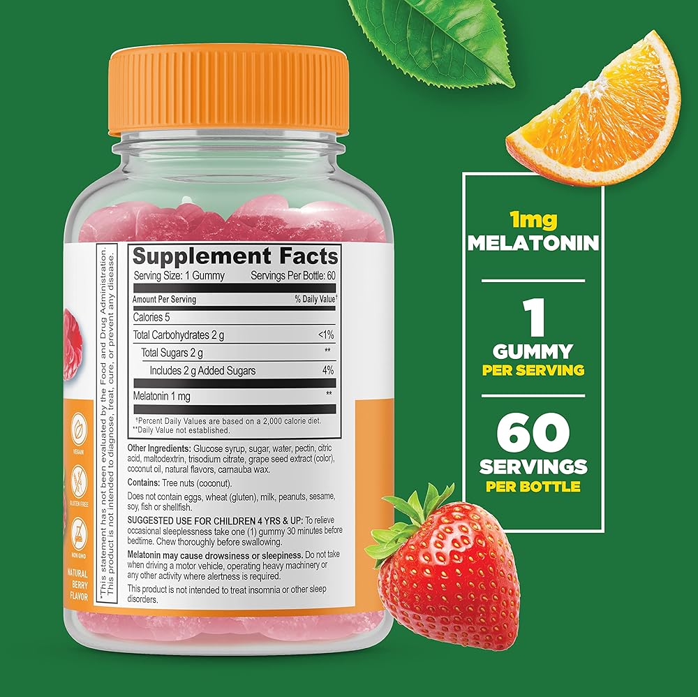 • 1 ملغ لكل حصة: تحتوي هذه الزجاجة على 60 قطعة مضغ، 60 حصة. تحتوي كل حصة على 1 ملغ من الميلاتونين. يُنصح الأطفال بتناول قطعة واحدة من العلكة.