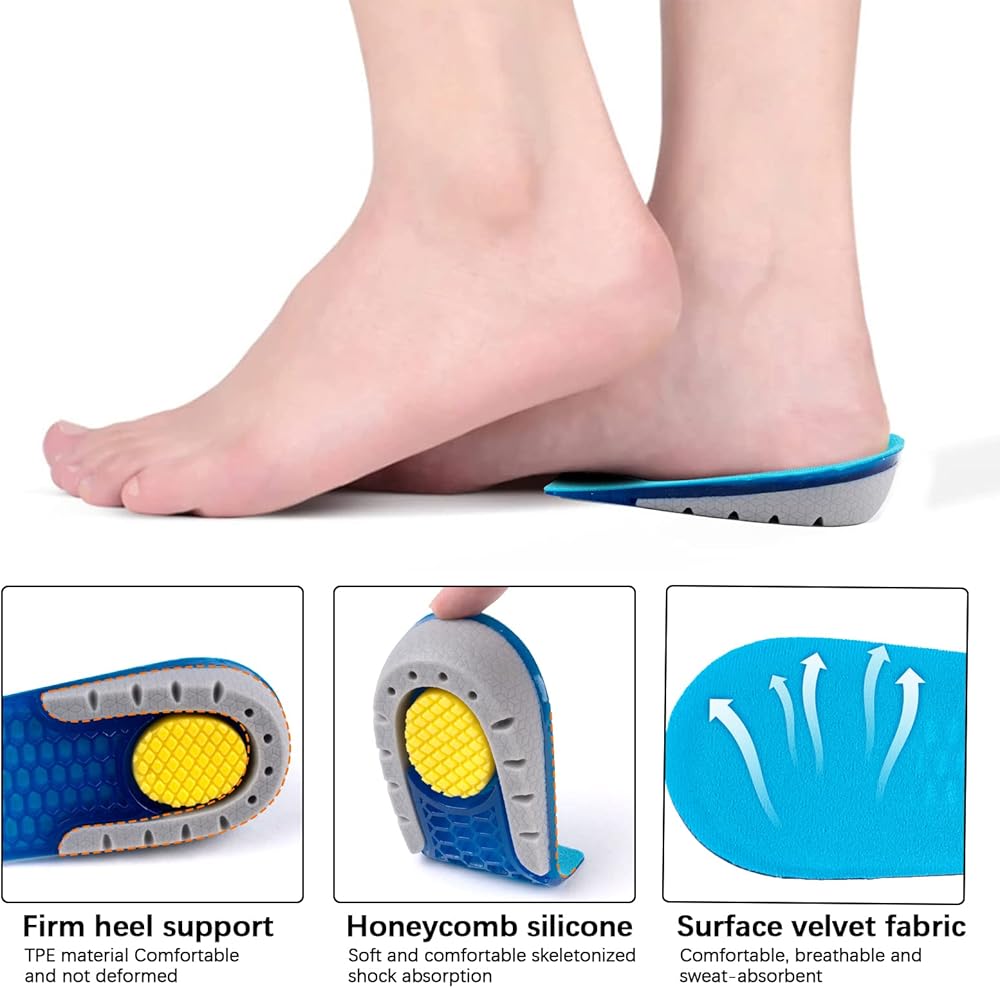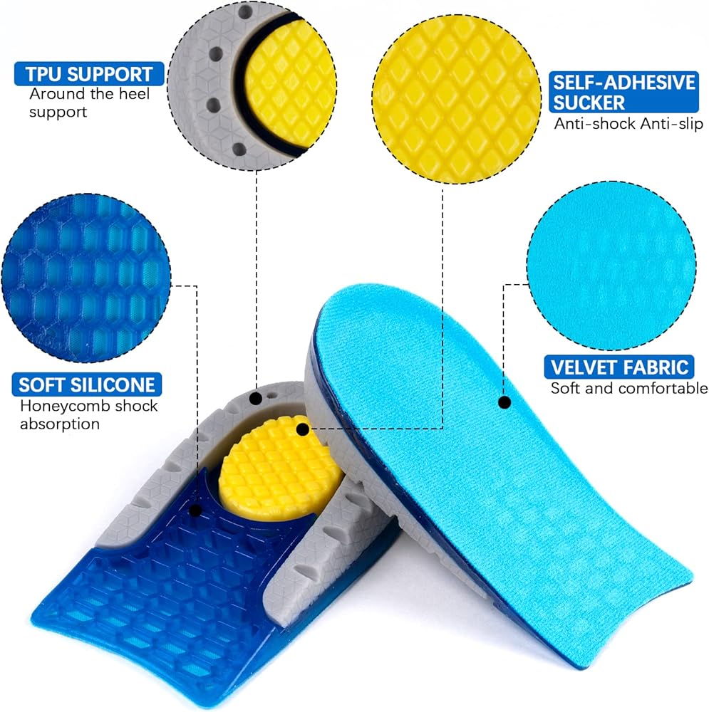 مادة عالية الجودة: حشوات رفع الكعب مصنوعة من جل البولي يوريثان الناعم والمتين من الدرجة الطبية. والنسيج جيد التهوية، وممتص للرطوبة، ومتين، وقابل للغسل. لاصق ذاتي قوي يبقى ثابتًا في مكانه من أجل راحة دائمة؛ تصميم بسيط وعملي على شكل قرص العسل يمكنه امتصاص الصدمات وتقليل الضغط ومنع النعال من الانزلاق داخل حذائك.