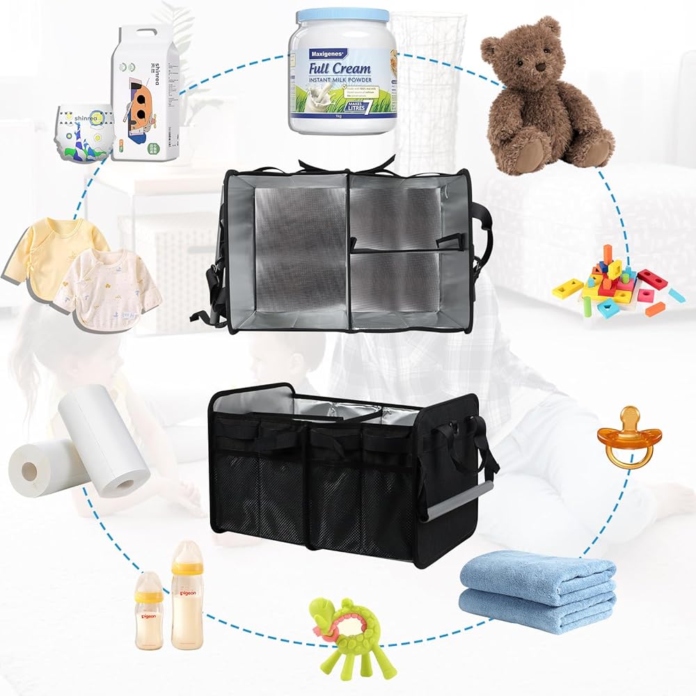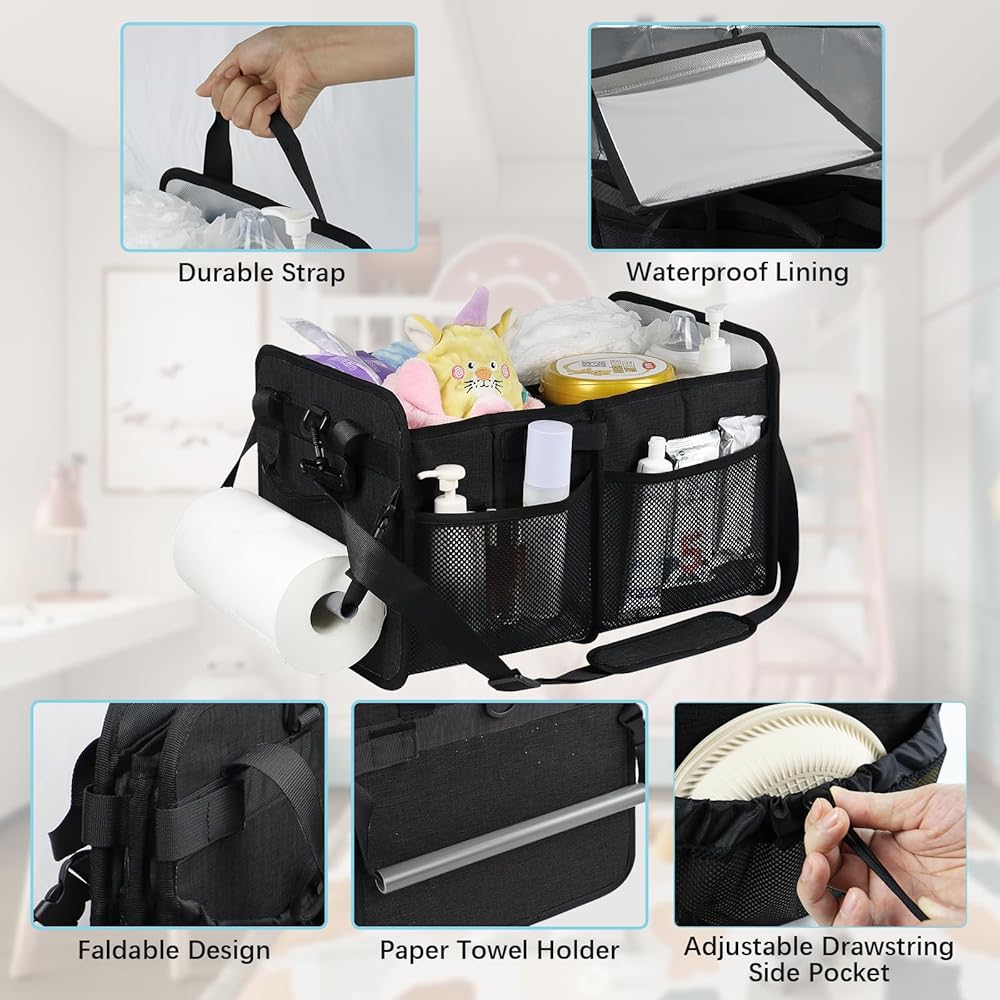 سعة كبيرة: - يتيح لك منظم الأطفال هذا الحصول على كل ما تحتاجه دون عناء. مثل إبريق الماء المقطر، حاوية التركيبة، الزجاجات، صابون/فرشاة الزجاجة، طن من الحفاضات، مناديل مبللة، حاوية مرهم الأطفال، ملابس الغسيل، التجشؤ. الملابس، والمرايل، وتغيير الملابس، واللهايات، وما إلى ذلك. ما عليك سوى وضع حقيبة الطفل هذه في سيارتك عندما تحتاج إلى الخروج - فهي تستوعب جميع مستلزمات الطفل الأساسية، مما يجعل رحلتك نسيمًا. بالنسبة للآباء أثناء التنقل، تعتبر حقيبة الحفاضات هذه ضرورية للغاية، مما يضمن نزهة خالية من التوتر مع طفلك!