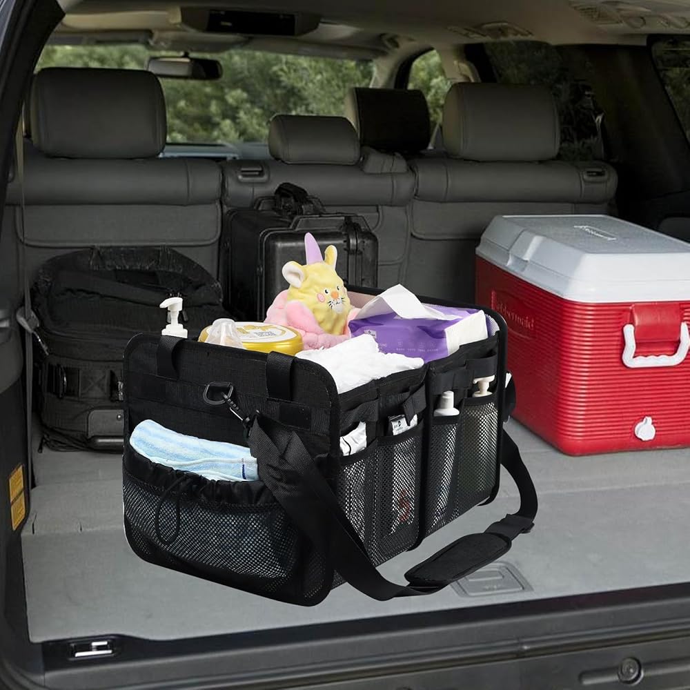هيكل صلب وتصميم حزام قابل للارتداء: - يتميز منظم الحفاضات هذا بتصميم قوي وقوي، مما يوفر حماية ممتازة لأساسيات الطفل ويمنع سحقها. تأتي مع حزام كتف، مما يسمح لك بارتدائها. يضمن التصميم السفلي القوي الثبات، ويمنع حقيبة الطفل من الاهتزاز حتى أثناء وجوده في السيارة المتحركة. تحافظ حقيبة السيارة هذه على العناصر الداخلية منظمة بشكل أنيق، كما أنها تعمل بشكل جيد كمنظم للسيارة.