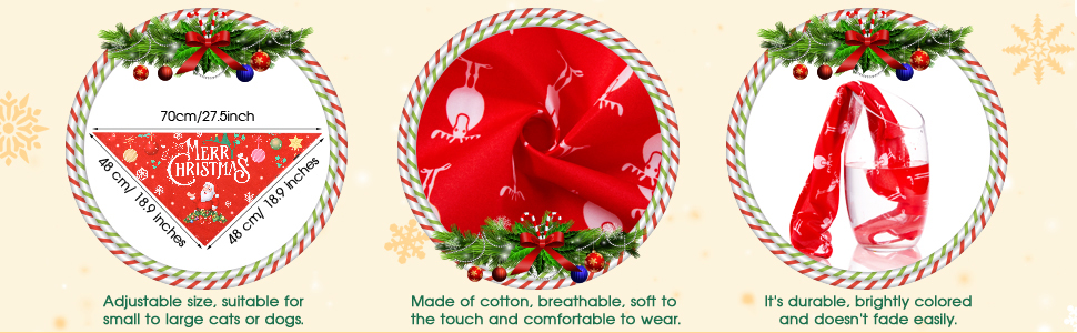 استخدامات واسعة: التصميم الأنيق والرائع يجعل مناديل عيد الميلاد للكلاب تناسب معظم المناسبات، رائعة للارتداء اليومي، ومناسبة لهم للترحيب بعيد الميلاد أو ليلة رأس السنة أو الارتداء اليومي؛ مناسبة أيضًا للشباب كضمادات للكاحل وربطات العنق والأوشحة وعصابات الرأس وما إلى ذلك، استخدامات مختلفة وعملية