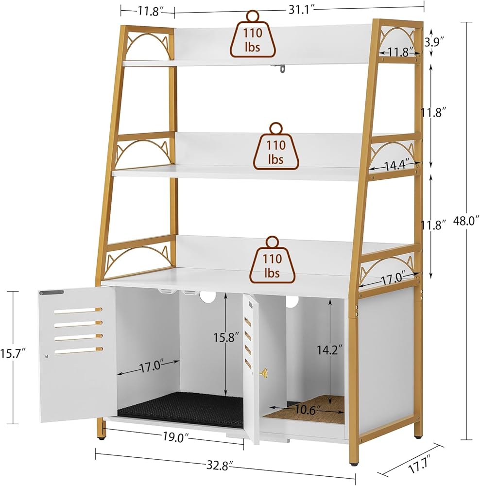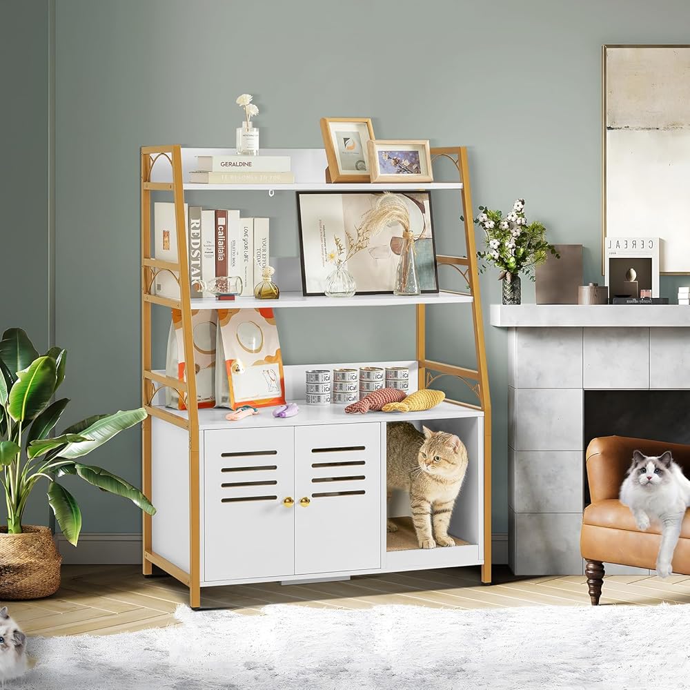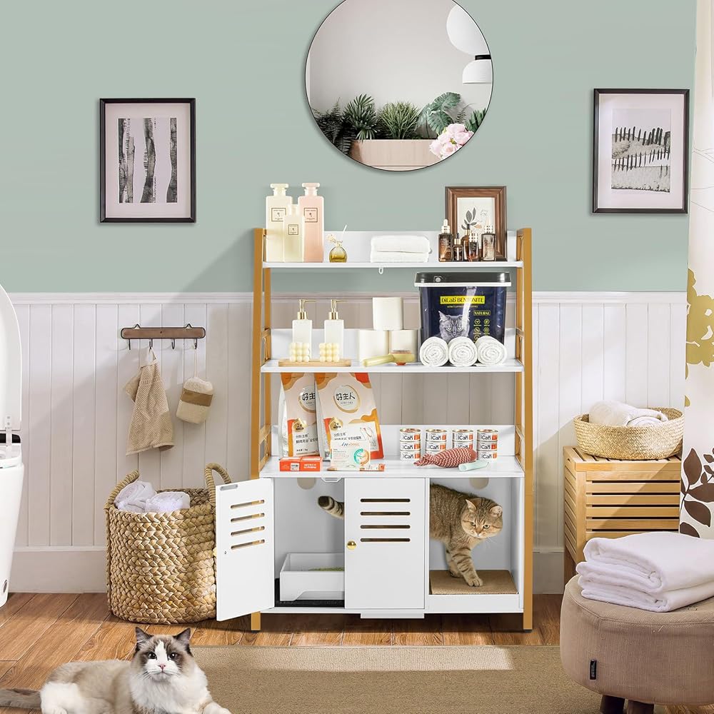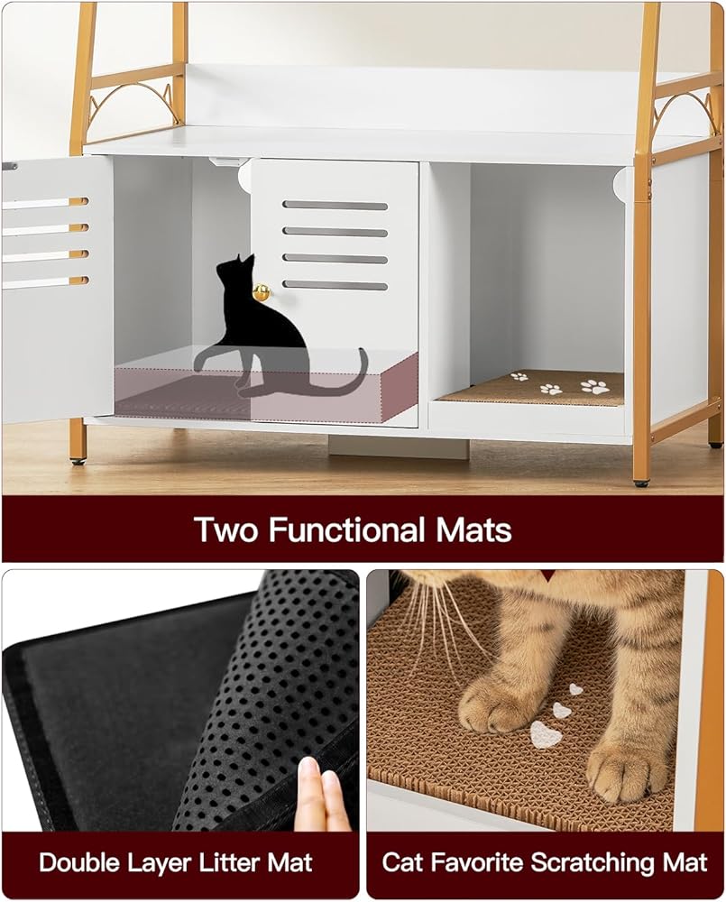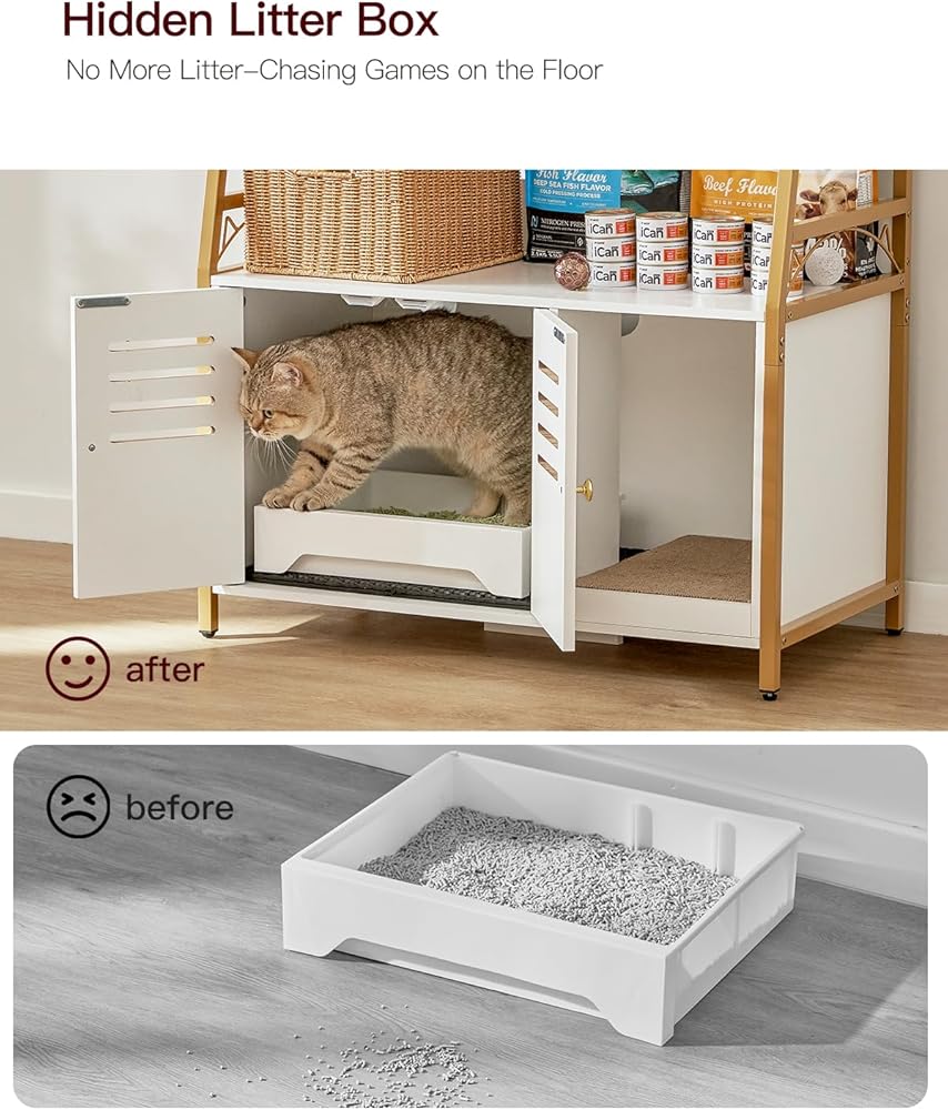 متعدد الوظائف: صندوق الفضلات الكل في واحد المخفي يحافظ على مساحتك مرتبة ويوفر مجموعة من الميزات التي من شأنها تحسين منزلك. الحل النهائي لك ولقططك! الحجم الداخلي لحمام القطط: 19 بوصة طول × 17 بوصة عرض × 15.8 بوصة ارتفاع، مناسب لمعظم صناديق القمامة