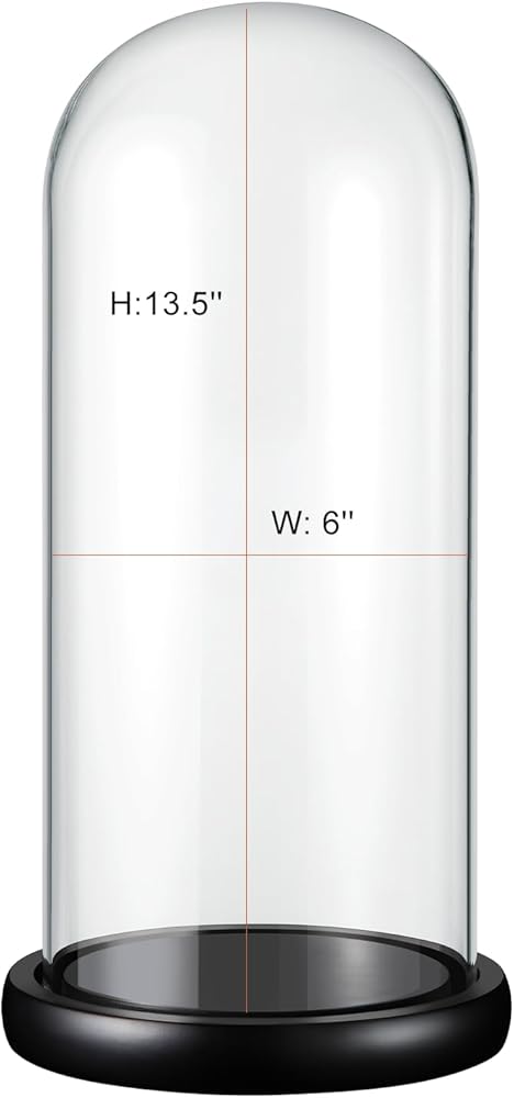 الحجم: قبة زجاجية 13.5 بوصة ارتفاع × 6 بوصة عمق، قاعدة خشبية سوداء بقطر 6.1 بوصة وسمك 0.7 بوصة.