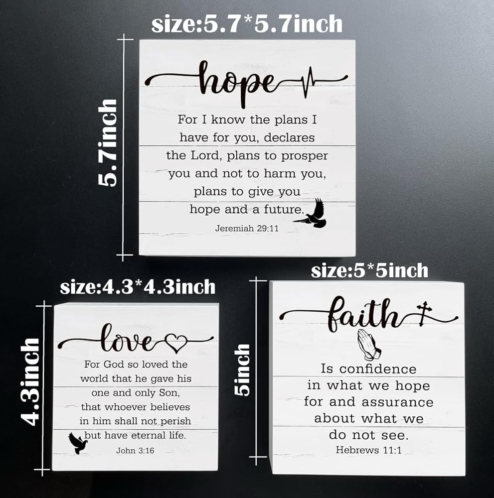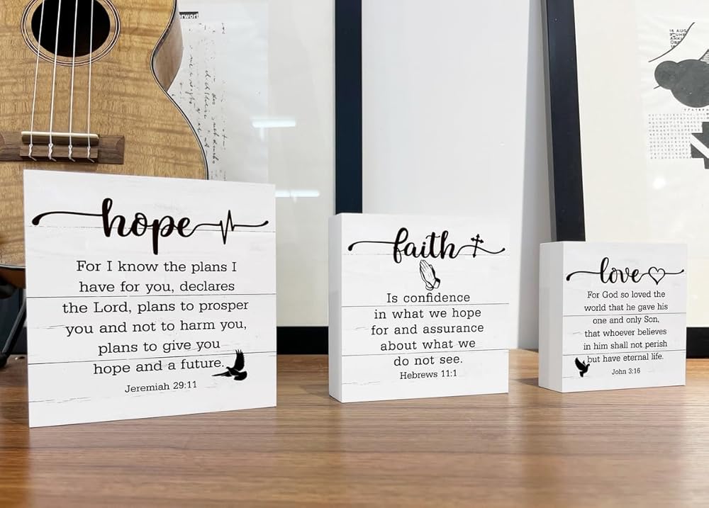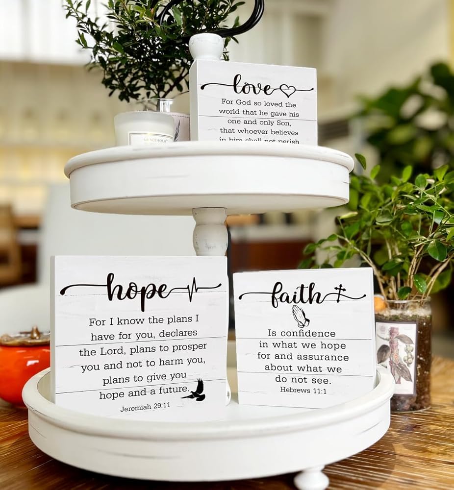 ديكور خشبي للمزرعة، علامة ديكور مسيحية، ديكور صينية متدرجة، فن مسيحي، ديكور منزلي ريفي، ديكور طاولة، اقتباسات ملهمة، أمل الإيمان والحب، آيات الكتاب المقدس الخشبية، 3 قطع علامات