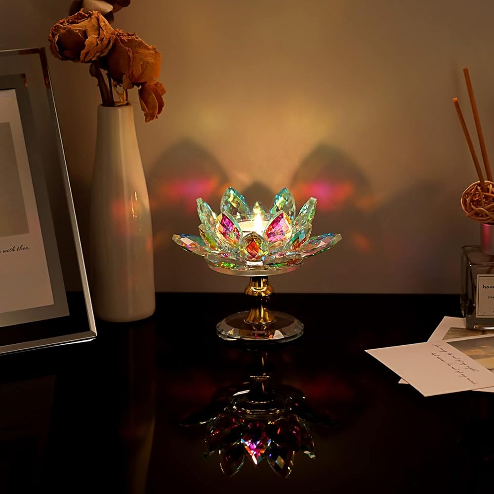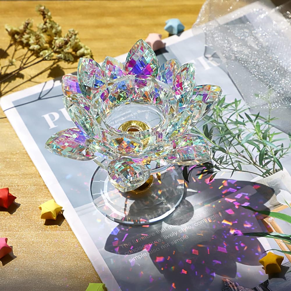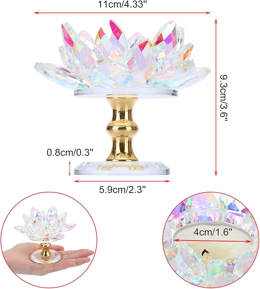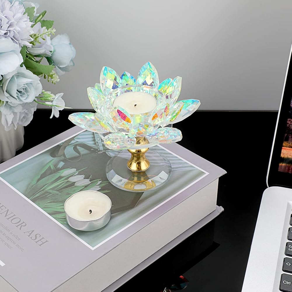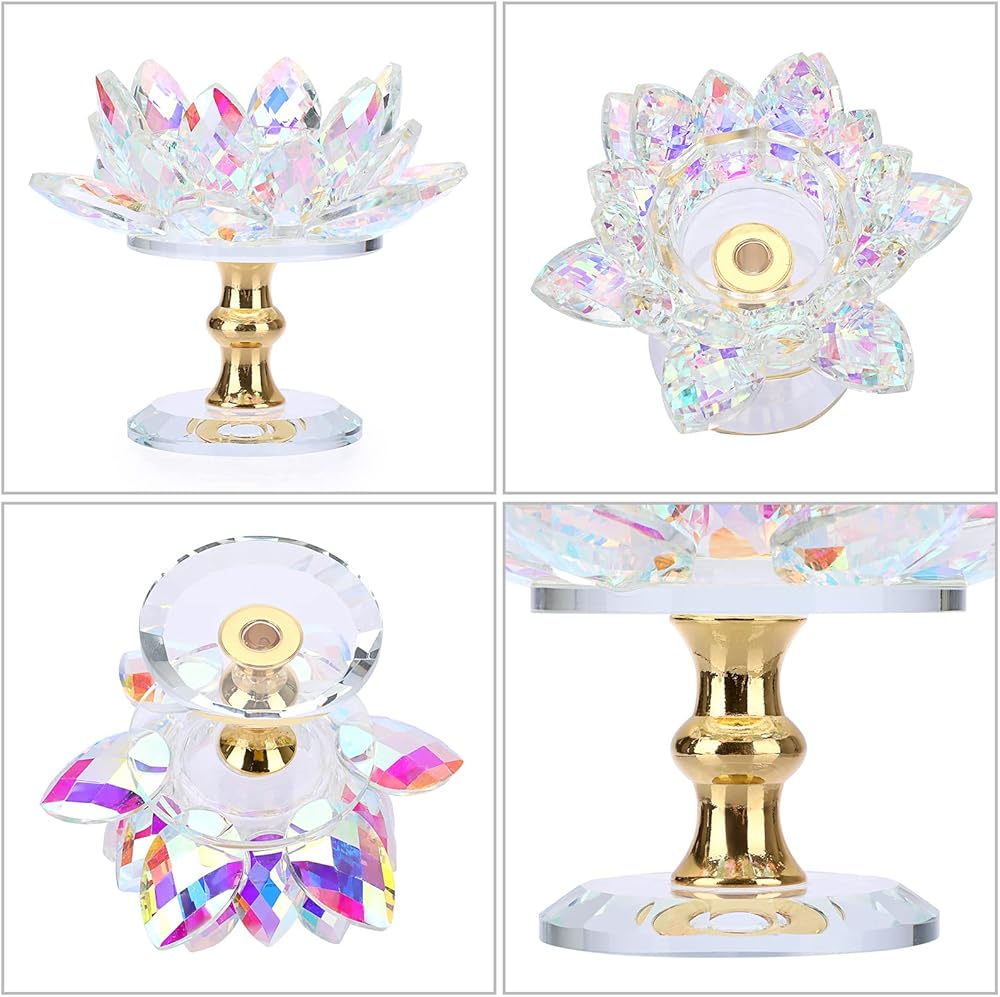 اون ماي حامل شموع من الكريستال على شكل زهرة اللوتس بتصميم زهرة اللوتس مع قاعدة زجاجية، حامل شموع زجاج قوس قزح لوتس تي لايت حامل شموع مصباح شمعة لتزيين الطاولة المركزية وحفلات الزفاف