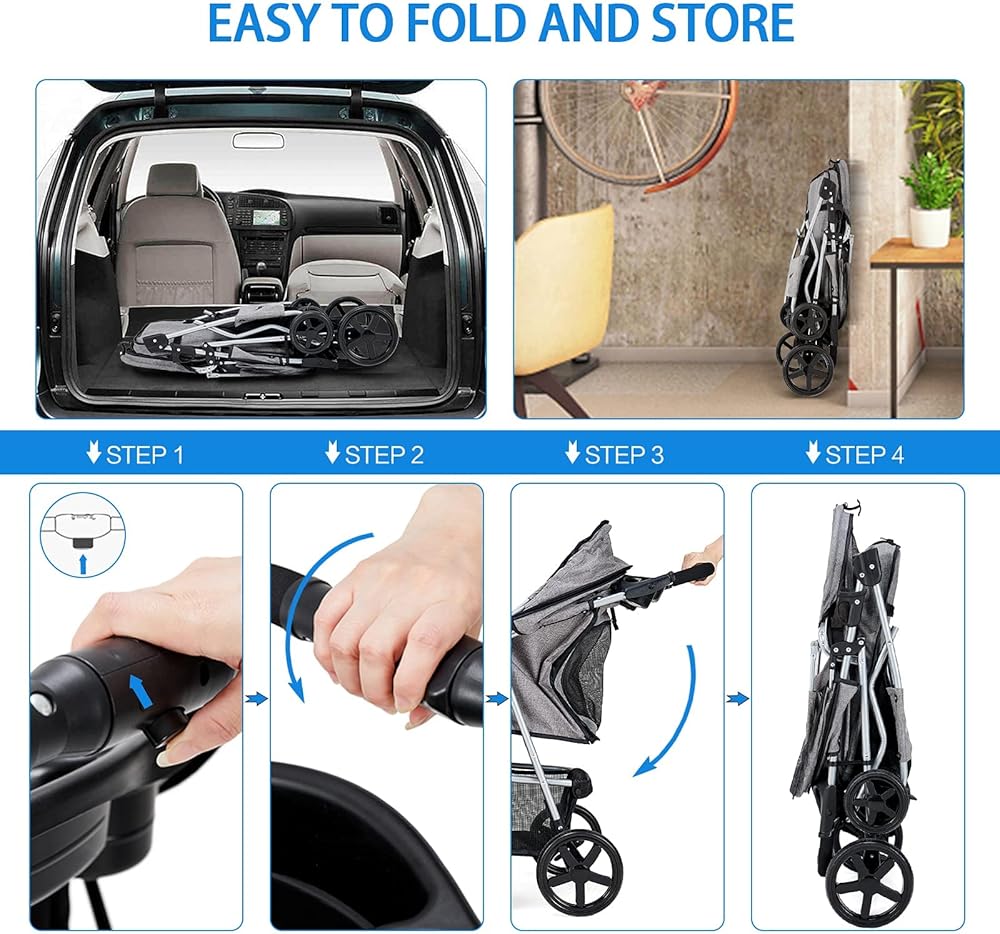【سهلة التجميع والطي】يمكن تجميع عربة الحيوانات الأليفة بسهولة بواسطة شخص واحد في بضع دقائق دون أي أداة أو مهارة. يمكن أيضًا طيها بسهولة إلى حجم صغير بيد واحدة فقط للتخزين المريح عند عدم الاستخدام. تصميم خفيف الوزن ومحمول يجعل التخزين والنقل سهلاً.