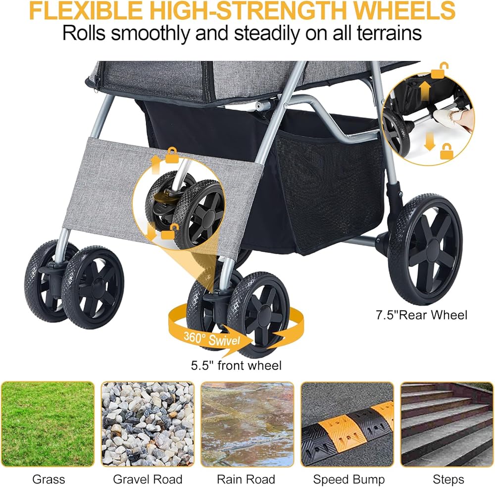 【عجلات مرنة】تتميز عربة الحيوانات الأليفة بعجلات متينة مقاس 7.5 بوصة تنزلق بسهولة على التضاريس الناعمة أو الوعرة، ويمكن للعجلات الأمامية أن تدور 360 درجة دون أطراف ميتة، ويمكنك أيضًا تشغيل المشي المستقيم لتحقيق نمط حياة متنقل كامل المزايا. تحتوي العجلات الخلفية على نظام فرامل بقدم واحدة لاستخدام أسهل وأكثر أمانًا.