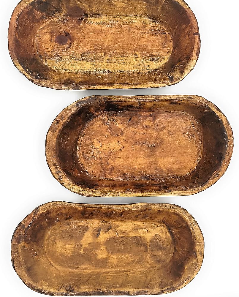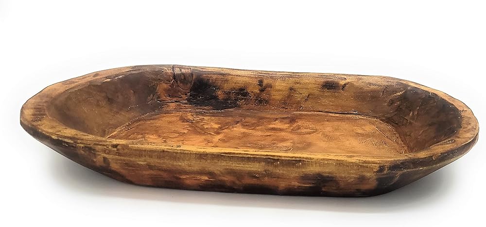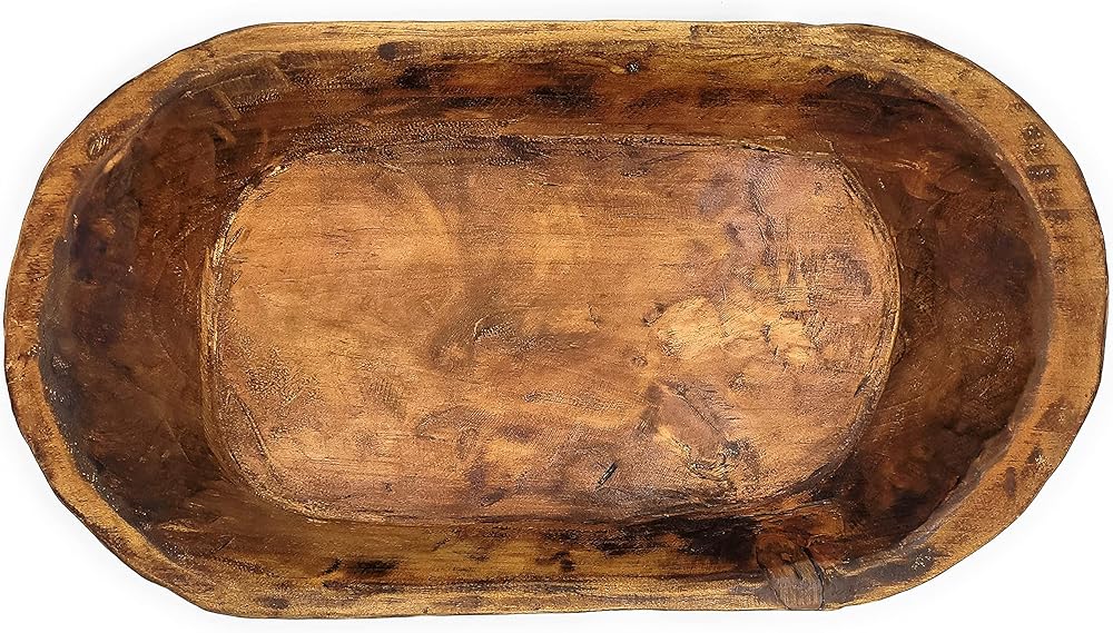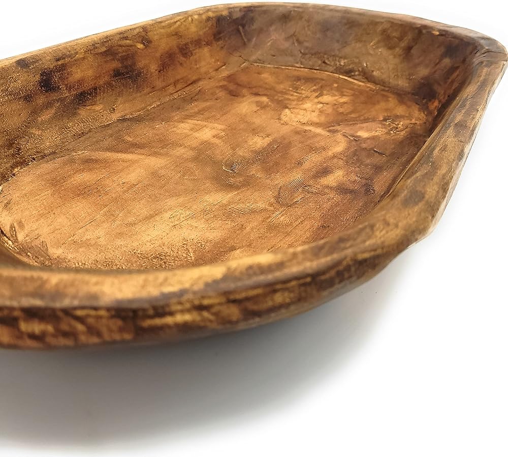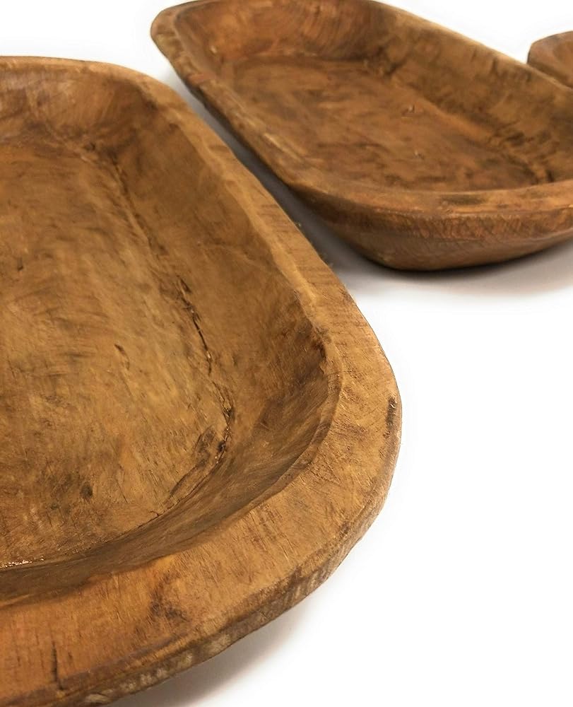 The sizing will vary from each one but roughly measure as follows: 20"-22" Long X 11-12" Width X 2.5"-3" Height * PLEASE NOTE THIS IS AN APPROXIMATE MEASUREMENT AND EACH PIECE WILL BE SLIGHTLY DIFFERENT AS IN ALL HANDMADE PIECES. *NO TWO BOWLS WILL BE ALIKE AS EACH ONE IS HANDCRAFTED- SIZE, COLOR AND CHARACTER MARKS WILL BE DIFFERENT ON EACH BOWL. COLORS WILL VARY BASED ON HOW THE WOOD TAKES THE STAIN- SOME WILL BE A BIT LIGHTER AND SOME A BIT DARKER. THESE ARE MADE TO LOOK RUSTIC. Meet "The Weston " - a farmhouse/rustic brown wooden decorative dough bowl. These rustic/farmhouse style wooden bowls are hand crafted and a perfect unique addition to your home. The Weston is a beautiful farmhouse brown which brings out the natural beauty of the wood. All of these dough bowls are handmade pieces and made individually- no two will be exactly alike which is what makes them unique. *These are for decorative use only, not food safe. *Note: Colors may vary slightly depending on computer/mobile device screen or lighting. **Please note there may still be rough edges/spots/cracks but we think this is what makes these pieces unique and one of a kind. Each of these are hand crafted. Every piece of wood has its own special story, imperfection and all. Colors, textures, and character marks will always be different from piece to piece.