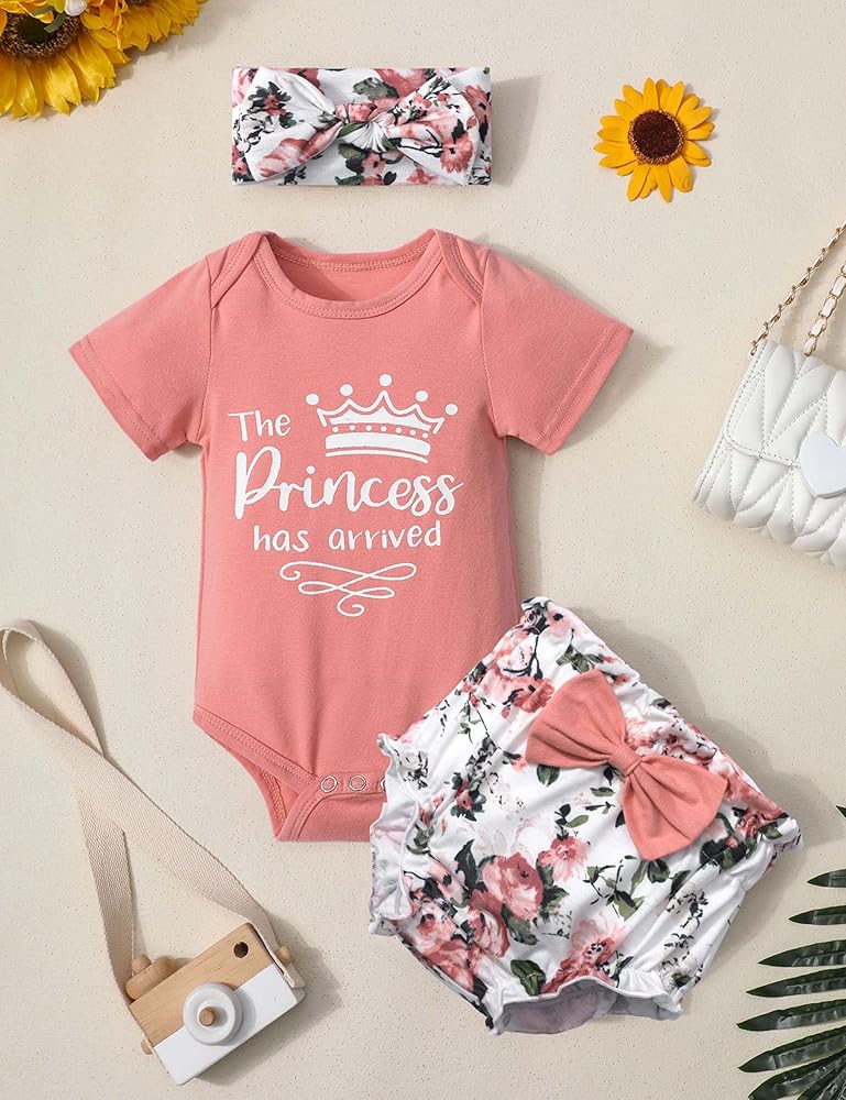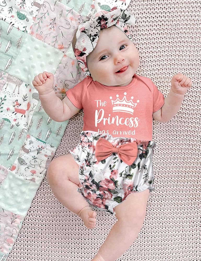 🌺🌺تصميم رائع: تتميز ملابس الفتيات حديثي الولادة من AGAPENG برقبة دائرية كلاسيكية وأكمام قصيرة مع موضوع مختلف، "Mommy's Little Girl"، و"Little Lady"، وطباعة حروف "The Princess قد وصلت"، وسروال قصير بحزام خصر مطاطي بنمط الزهور/الخنفساء المكشكش، مطابقة مع عقال لطيف. تغيير الحفاضات بسهولة مع إغلاق بأزرار كبس. نمط مختلف للاختيار، يبدو لطيفًا بشكل خاص! تم تصميم كل التفاصيل للطفل، ملابس طفلة جميلة للهدايا.