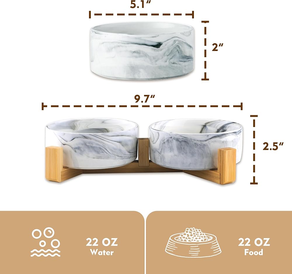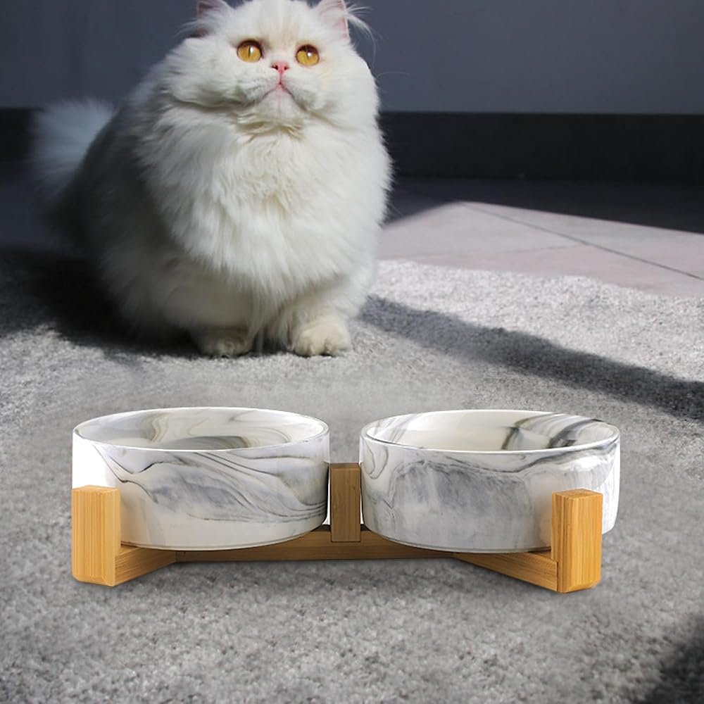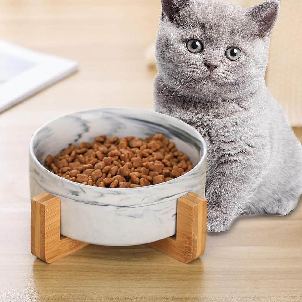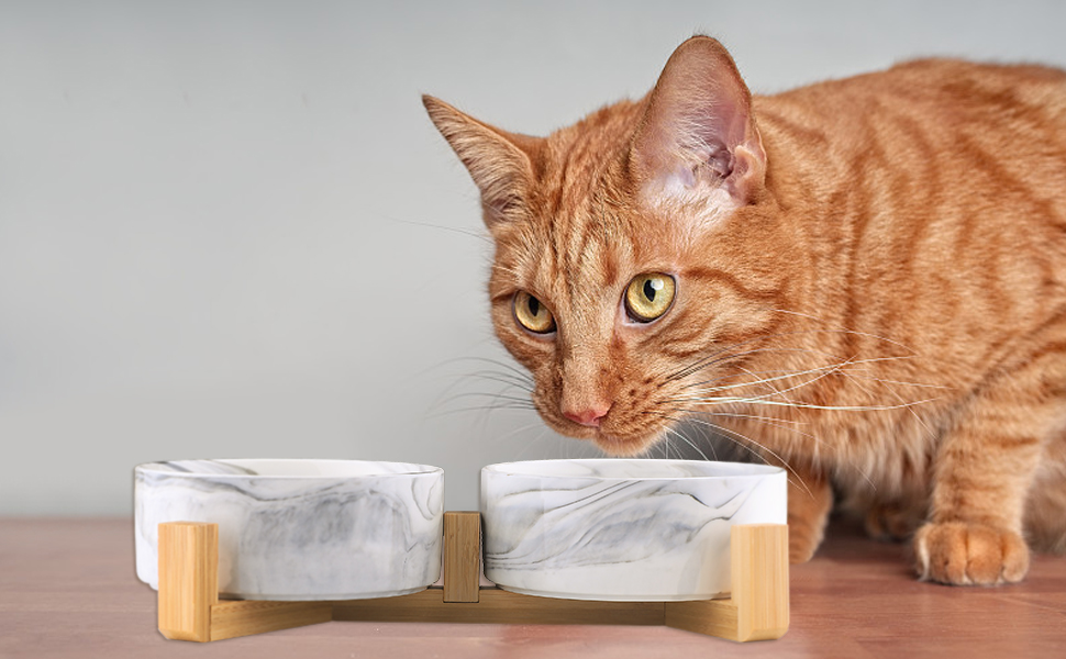 Bamboo Wood Stand:The bamboo wood bowl stand is finely sanded and polished to prevent sticking and scratching, taking care of you and your cat's health. The bamboo wood stand and marbled ceramic bowl are simple and beautiful, and will fit perfectly into any home decor style. It also makes a perfect gift to surprise and delight pet lovers.