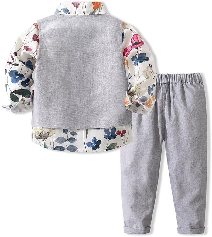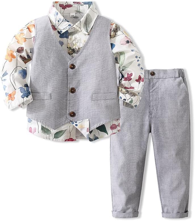 Little Boys' 3 Piece Causal Outfit Set, Includes Flower Print Dress Shirt, Dress Pants, Vest.