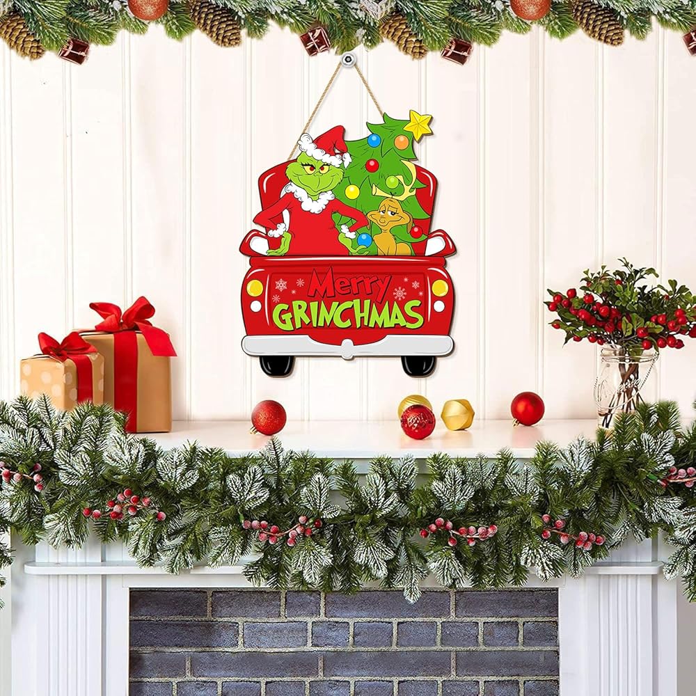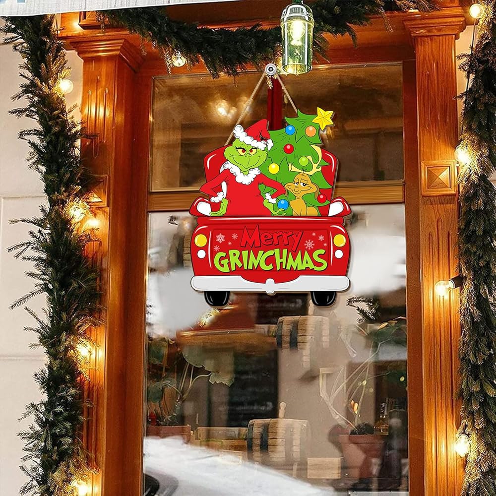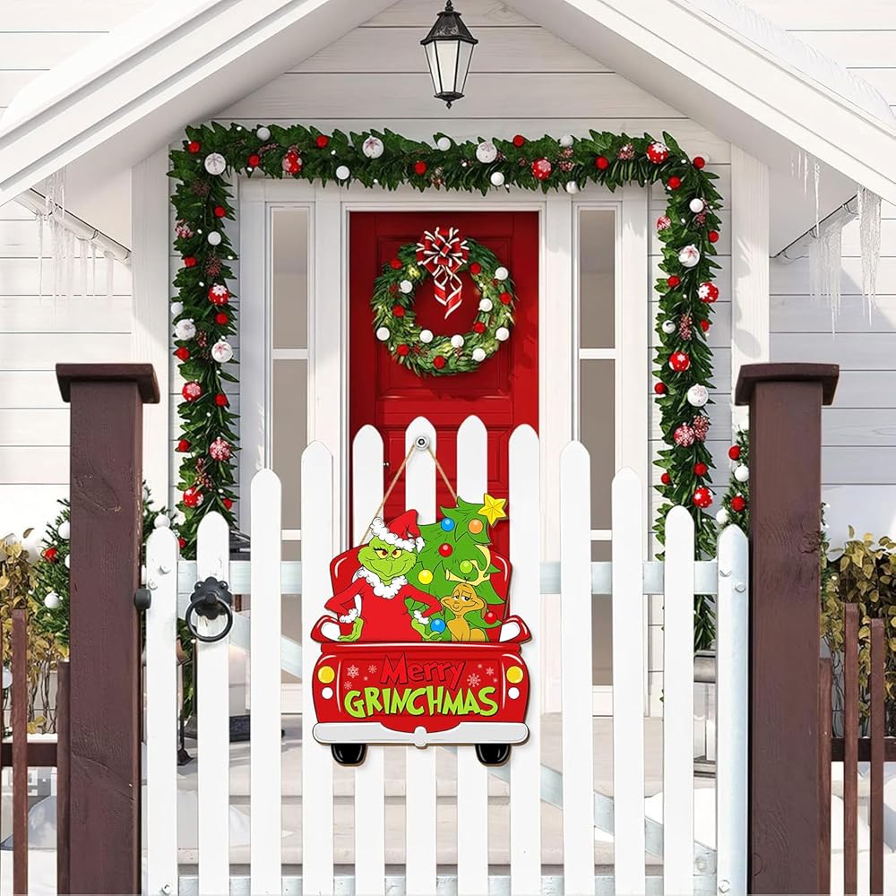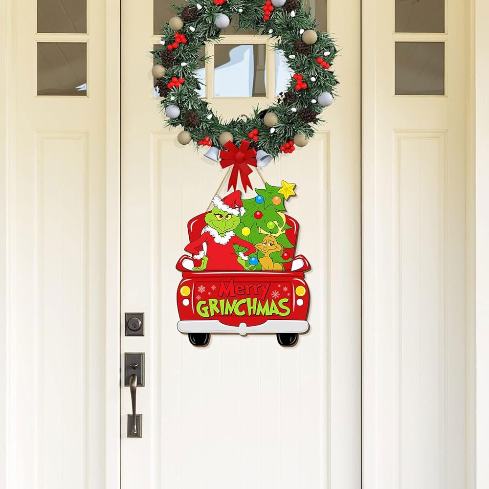 باب عيد الميلاد شنقا زينة علامة، عيد ميلاد سعيد اكليلا شاحنة عيد الميلاد للباب الأمامي، شجرة عيد الميلاد مع الكلب علامات الباب الخشبي المنزل لجدار الشرفة داخلي في الهواء الطلق عطلة الديكور