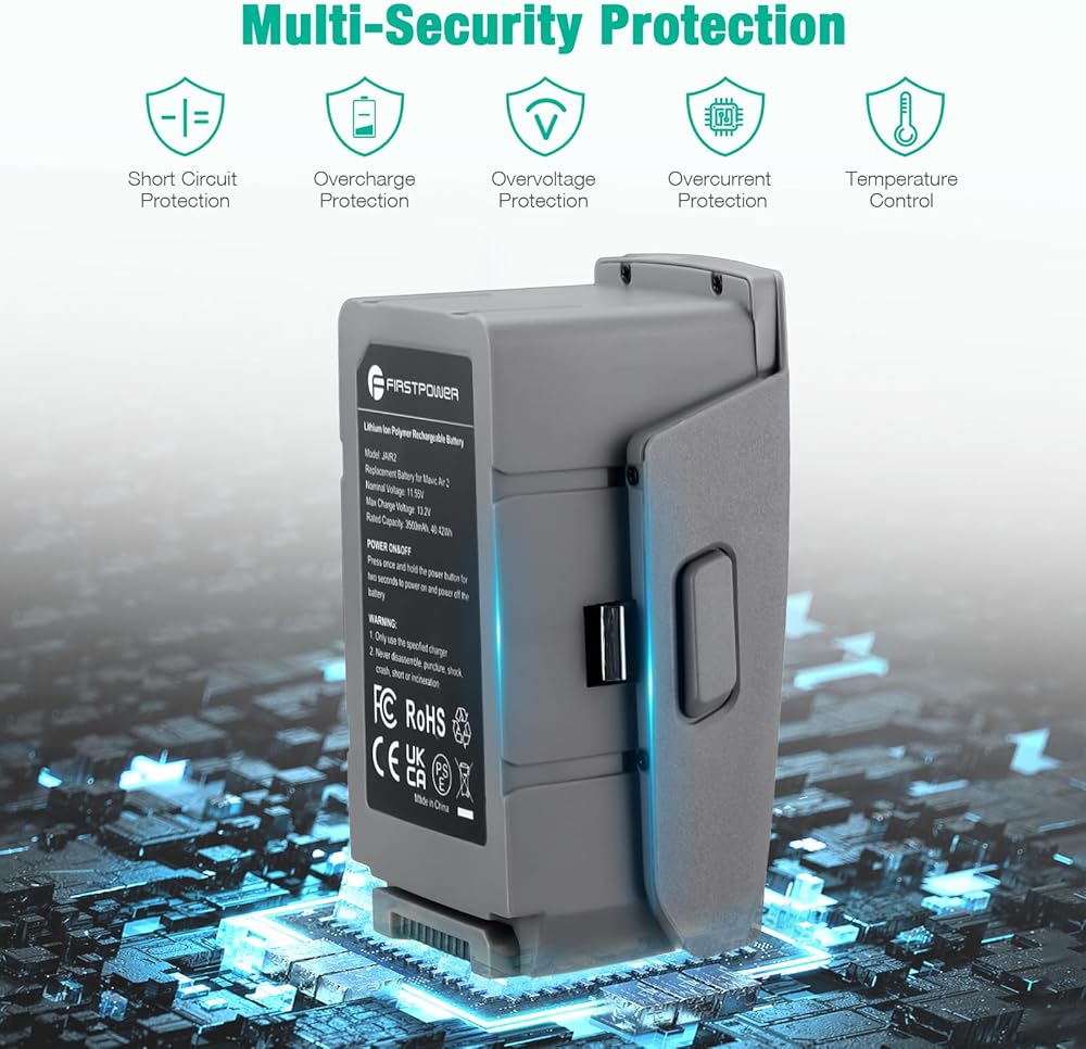 【حماية أمان متعددة】خضعت بطارية FirstPower Mavic Air 2 لاختبارات وشهادات متعددة. وهي مجهزة بوسائل حماية متعددة مثل التفريغ الذاتي، والشحن الزائد، والجهد الزائد، وارتفاع درجة الحرارة، وحماية الدائرة القصيرة لضمان عدم حدوث أي مشاكل أثناء الاستخدام.