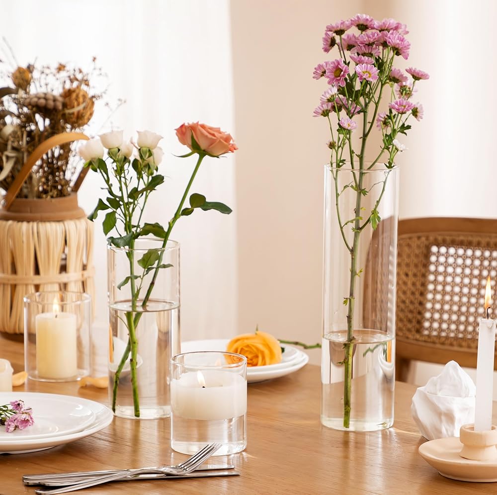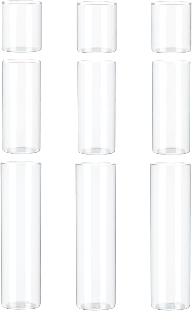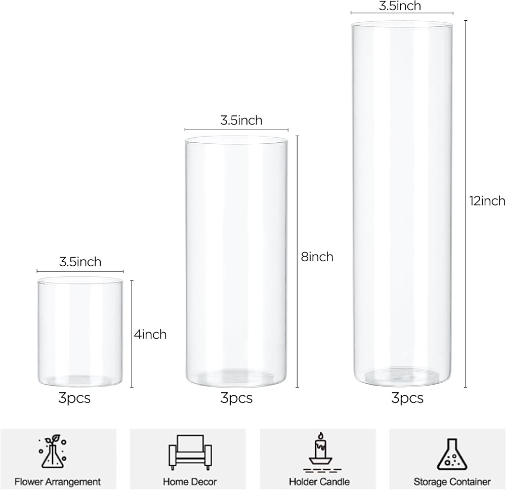 【ما حصلت عليه】سوف تحصل على 9 مزهريات أسطوانية زجاجية، تتضمن مزهريات بعرض 3.5 بوصة في 3 ارتفاعات مختلفة - 4 بوصة، 8 بوصة، 12 بوصة؛ يمكن للمزهرية الزجاجية مقاس 3.5 بوصة أن تتطابق تمامًا مع الشمعة الأسطوانية مقاس 3 بوصة أو الشمعة العائمة أو جميع أنواع الزهور. هذا المزيج يمكن أن يلبي احتياجاتك المختلفة.