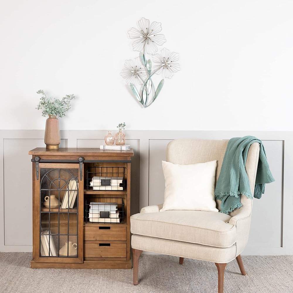 سطع جدار عادي في منزلك مع ديكور الحائط ثلاثي الأزهار. مصنوعة من معدن متين مع الفضة والأزرق، هذه القطعة ساحرة وجميلة. اعرضها في منزل عصري لإضفاء إحساس متماسك. النمط: مزرعة ، ريفي ، جنوب غرب