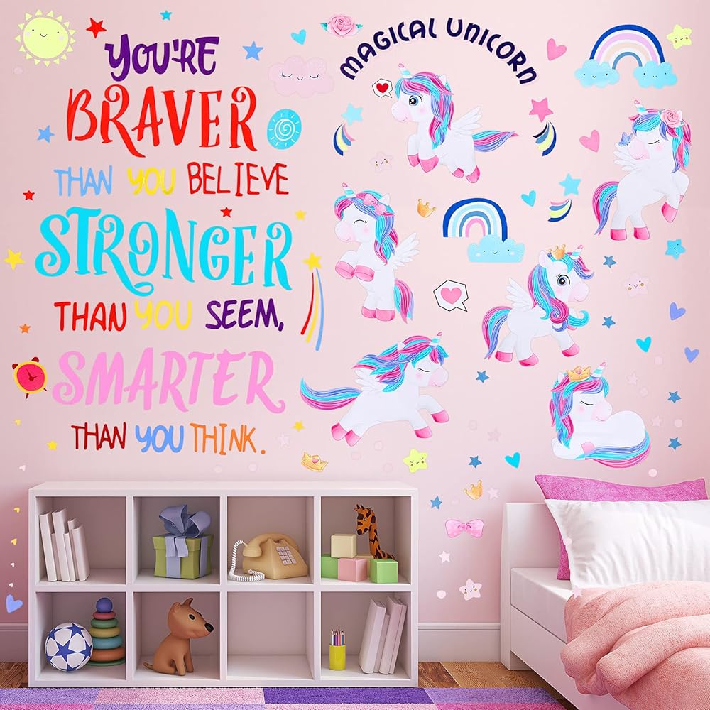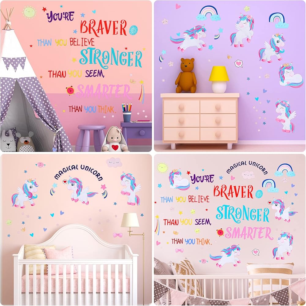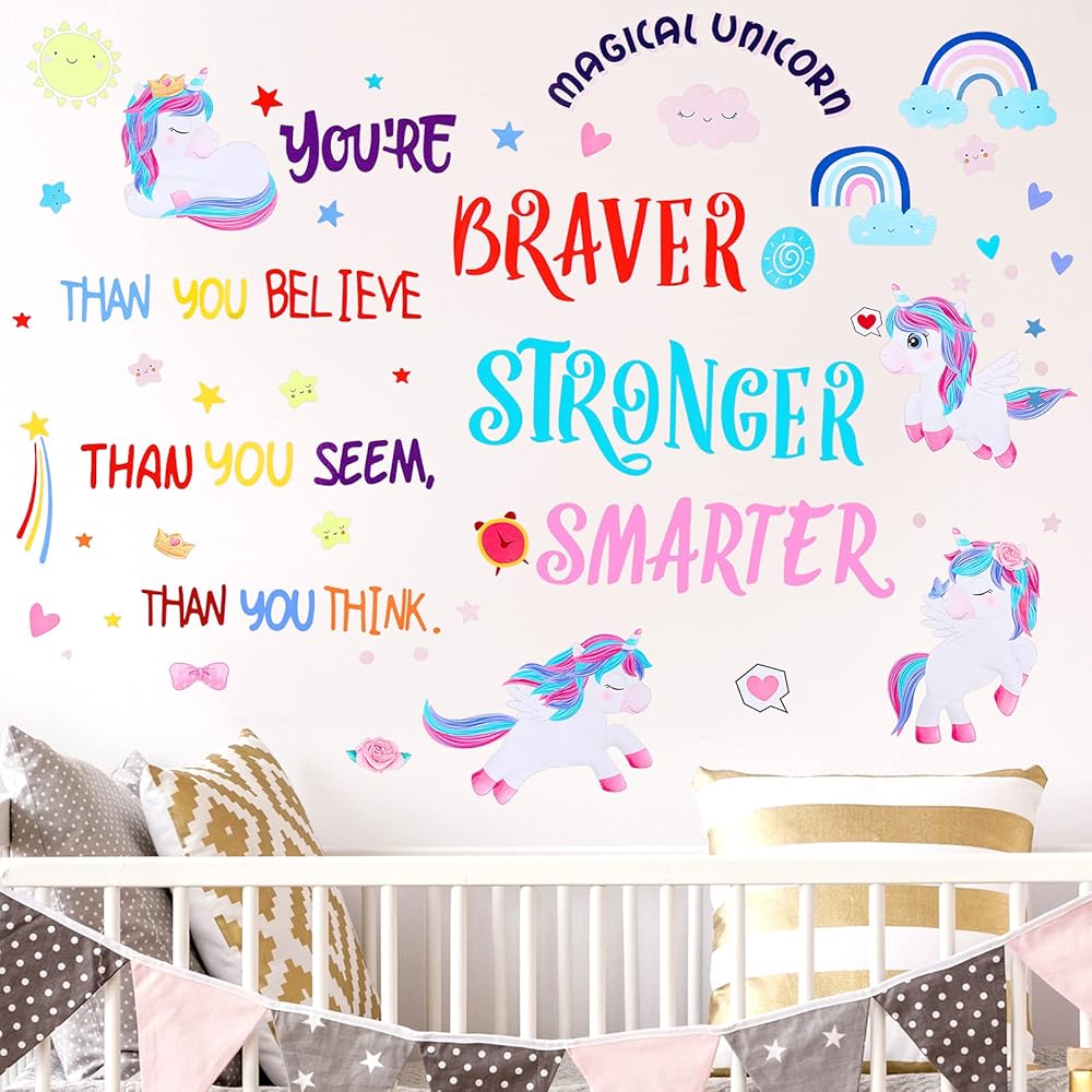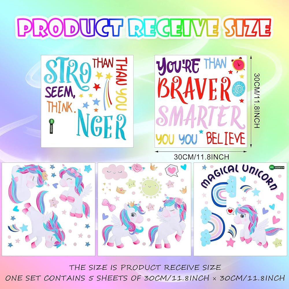 محتويات العبوة: ستحصل على 5 أوراق ملصقات حائط ملونة (تقريبًا 11.8 × 11.8 انش)، بما في ذلك ورقتين من ملصقات العبارات التحفيزية و3 ورقات من ملصقات الحائط بنمط يونيكورن؛ ملصقات الاقتباسات الإيجابية مطبوعة بكلمات "YOU'RE BRAVER THAN YOU BELIEVE, STRONGER THAN YOU SEEM, SMARTER THAN YOU THAN YOU THINK", مما يساعد أطفالك على تطوير موقف إيجابي