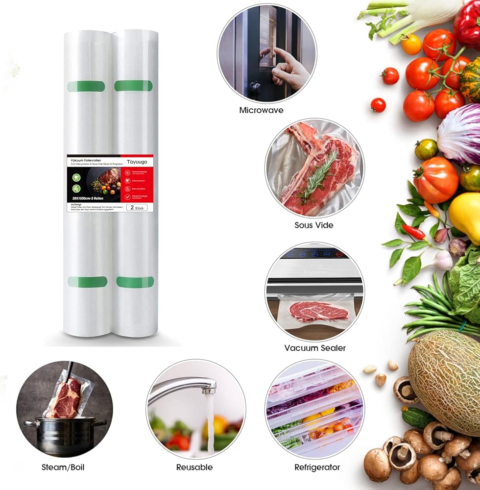 → GREAT VACUUM COMPATIBILITY: These compact vacuum sealers measure 28cm (W) x 3m (L) per roll for a total of 6m. They are compatible with many vacuum sealants, especially some with built-in cutters. Works perfectly with vacuum sealers.