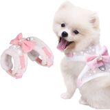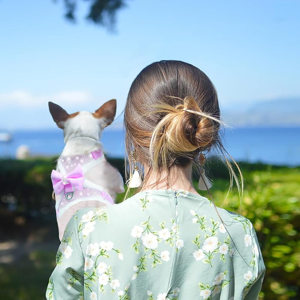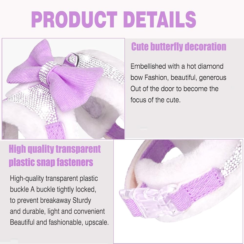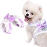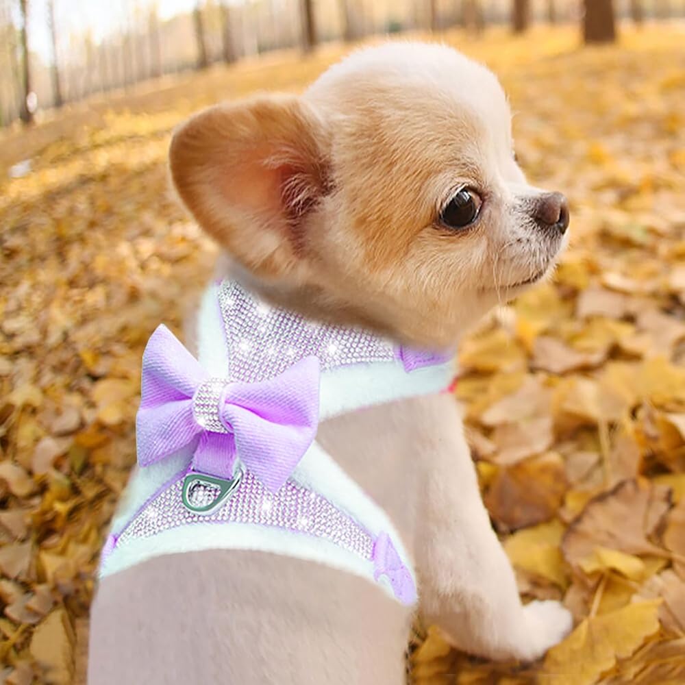 Shiny Diamond Dog Harness - Made of suede microfiber material with breathable mesh lining on the back for more comfortable, wearable and skin-friendly wear. The large small diamonds and the bow on the carrier make your pet more cute and attractive.