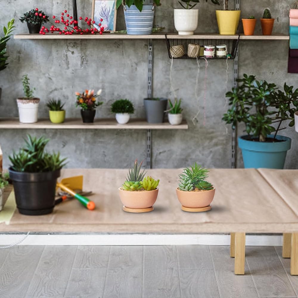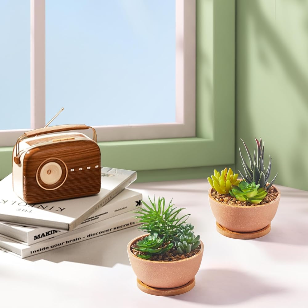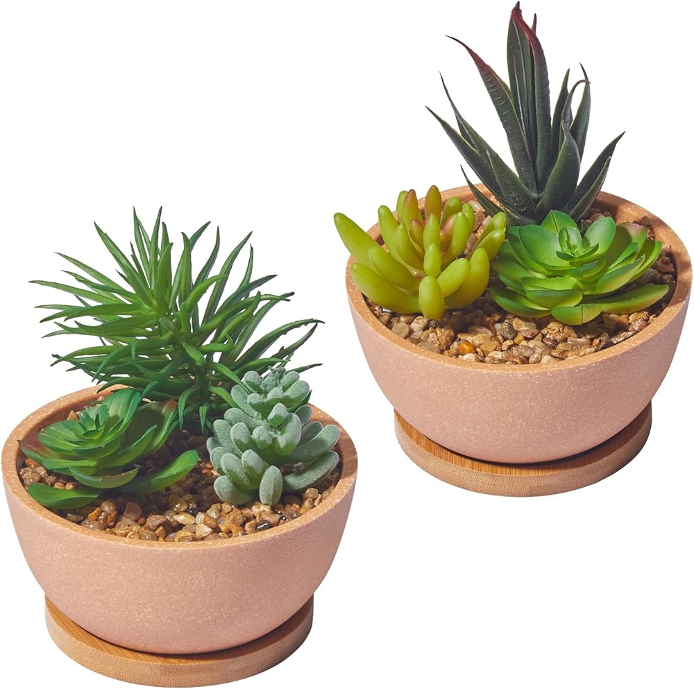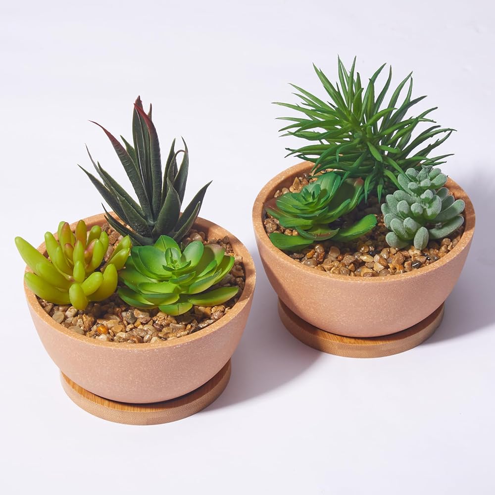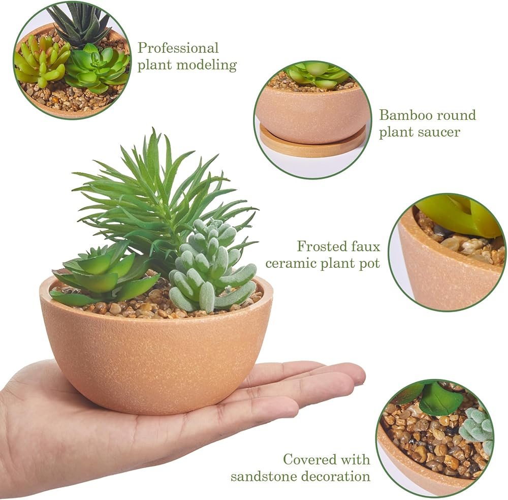 أواني مصنوعة بشكل جميل: مصنوعة من البلاستيك مع البورسلين الصناعي ولمسة نهائية بلورية للحصول على وعاء أكثر جمالًا. يعمل الحصى كتربة للنباتات، مما يجعل هذه النباتات الصناعية الصغيرة أكثر واقعية.