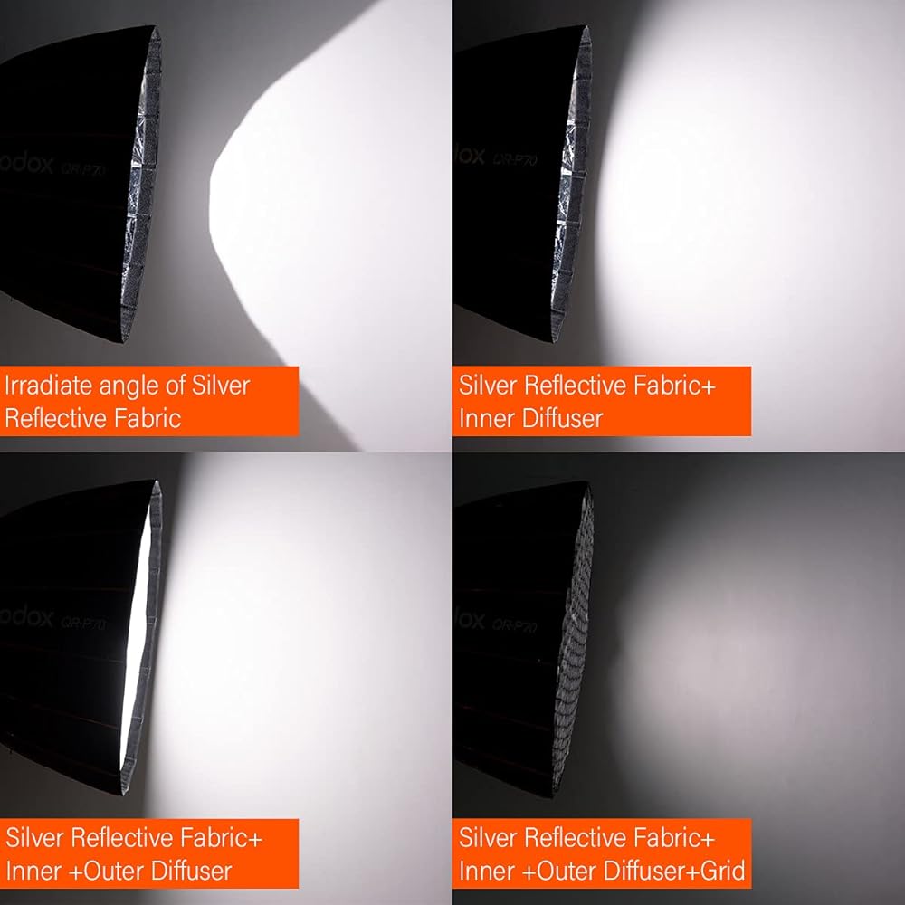 [اصنع الإضاءة الخاصة بك] يحتوي سوفت بوكس على جزء داخلي فضي عاكس لإضفاء تباين عالٍ وضوء مقرمش. تتضمن شبكة قماشية متاحة لتضييق انتشار الشعاع من أجل تحكم أكثر دقة.