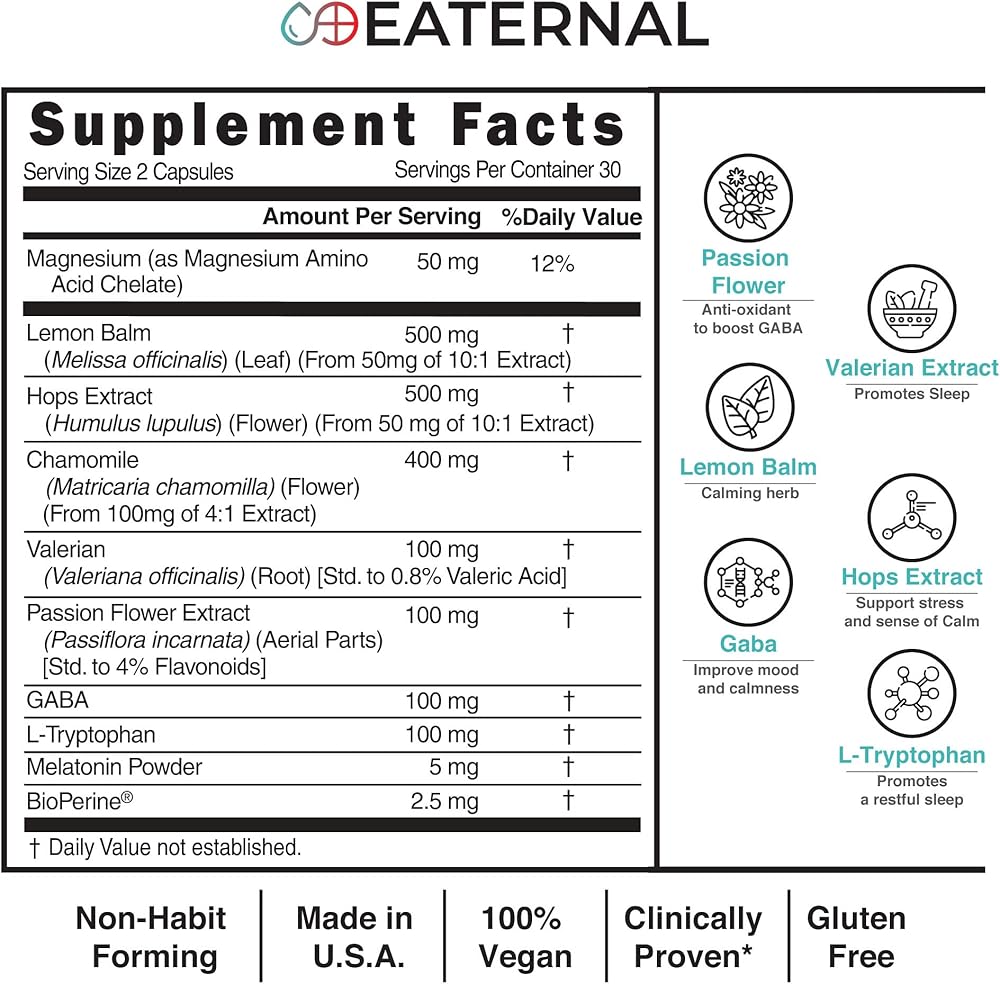 تجتمع الطبيعة والعلم لابتكار دعم النوم: قبل الطب الحديث، استخدم أسلافنا الأعشاب مثل جذر فاليريان، والجنجل، وبلسم الليمون، والبابونج، وزهرة العاطفة. تجمع تركيبة Eaternal Nutrition بين المكونات في شكل كبسولة ملائمة. ستستمتع أيضًا براحة البال عندما تعلم أن تركيبتنا نباتية 100%، وخالية من الغلوتين، وغير معدلة وراثيًا.