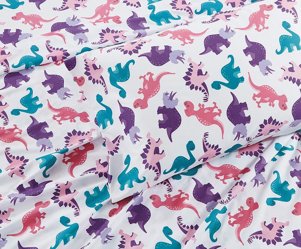 3pc Crib Sheet Set to Create a kids room with dinosaurs of different colors. Set Includes: 1 Fitted Sheet (28" x 58"), 1 Flat Sheet (45" x 60") and 1 Pillow Cases (20" x 30"). 100 % Microfiber. Machine Wash Cold, Tumble Low Dry.