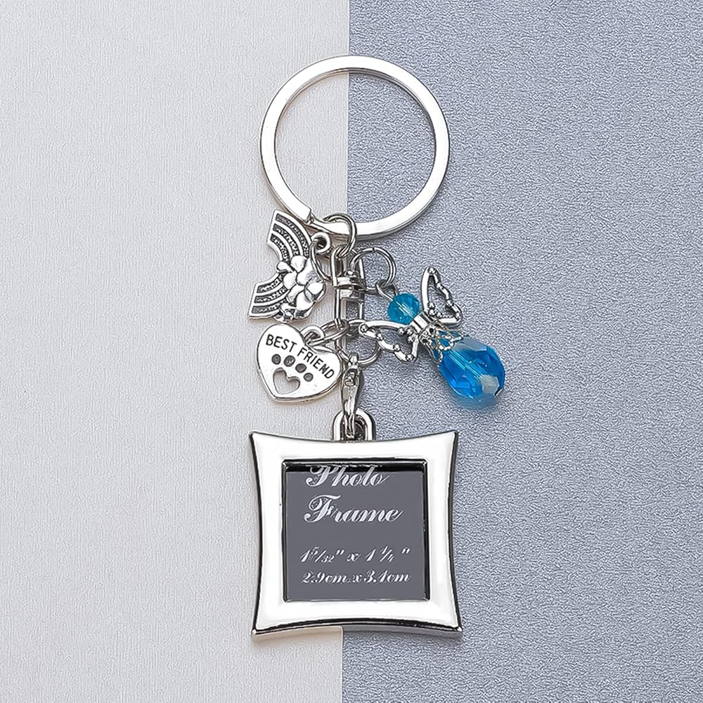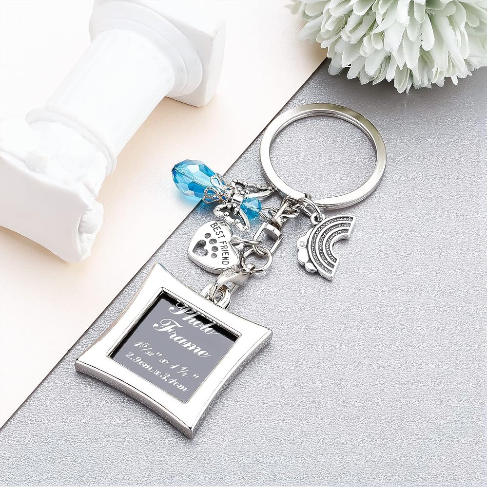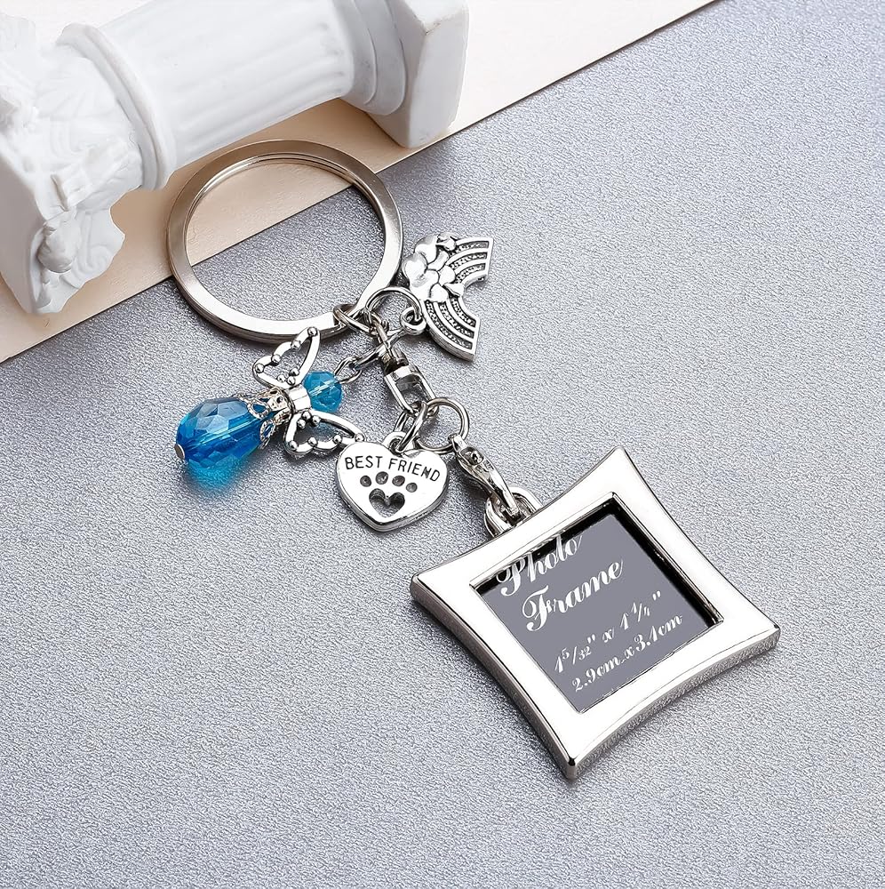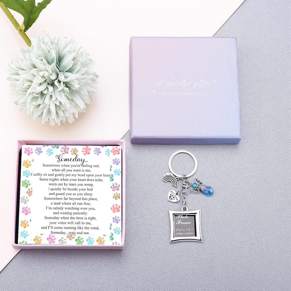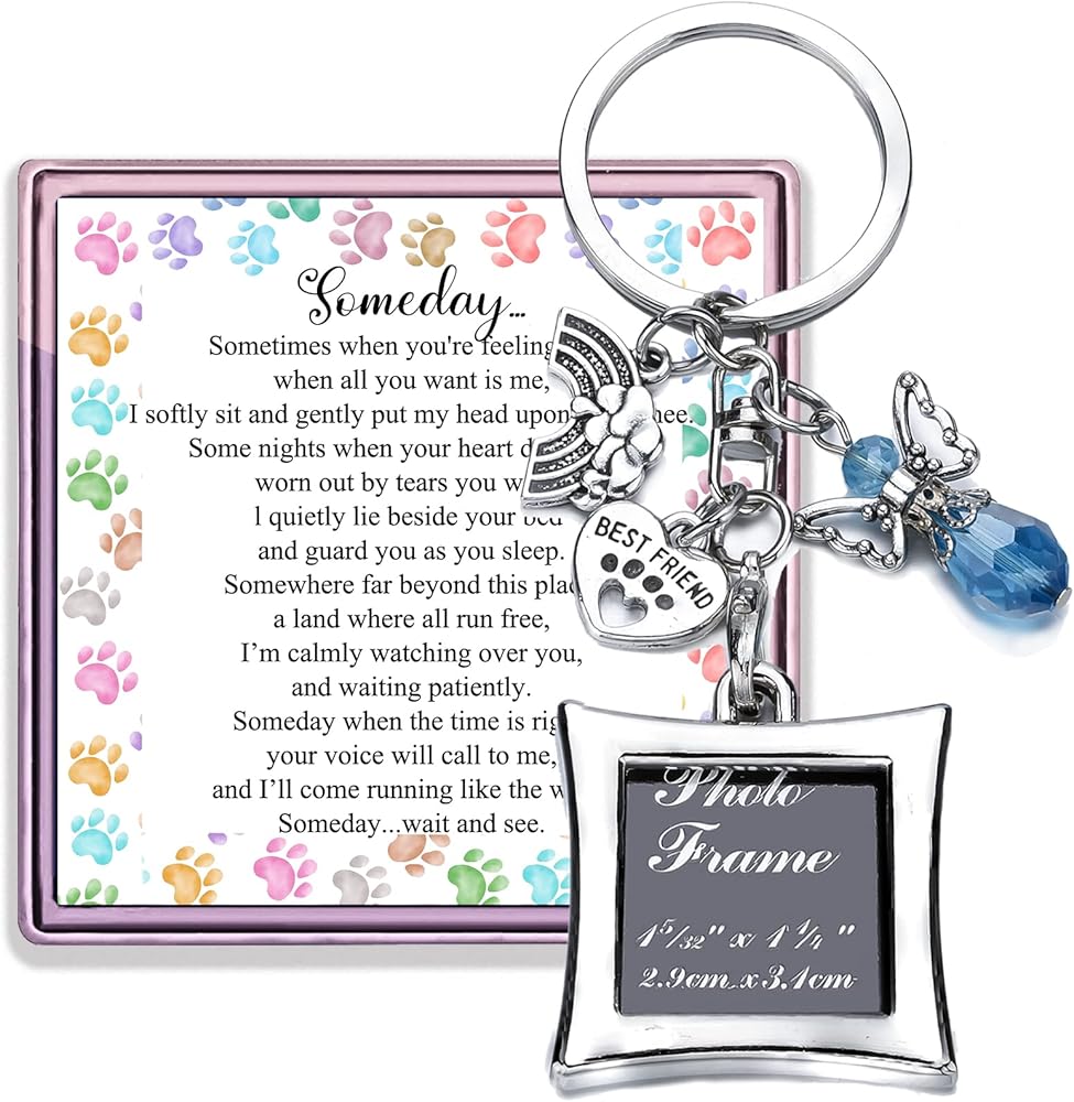 Rainbow bridge pet memorial gifts :Dog memorial picture frame keychain with a waiting at the door sentimental sympathy poem to help a grieving friend or loved one remember a special pet. Pet memorial picture frame comes with a rainbow bridge charm,paw print best friend charm and a blue guardian angel charm
