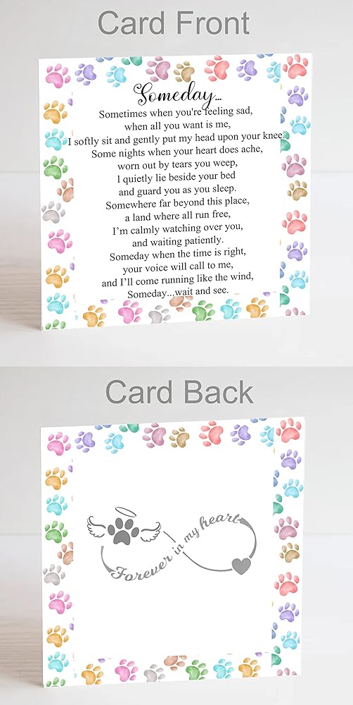 Pet Memorial Card: Someday... Sometimes when you're feeling sad, when all you want is me, I softly sit and gently put my head upon your knee. Some nights when your heart does ache, worn out by tears you weep, l quietly lie beside your bed and guard you as you sleep. Somewhere far beyond this place, a land where all run free, I'm calmly watching over you, and waiting patiently. Someday when the time is right, your voice will call to me, and I'll come running like the wind, Someday...wait and see.
