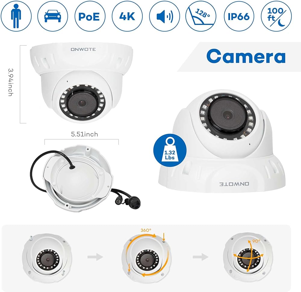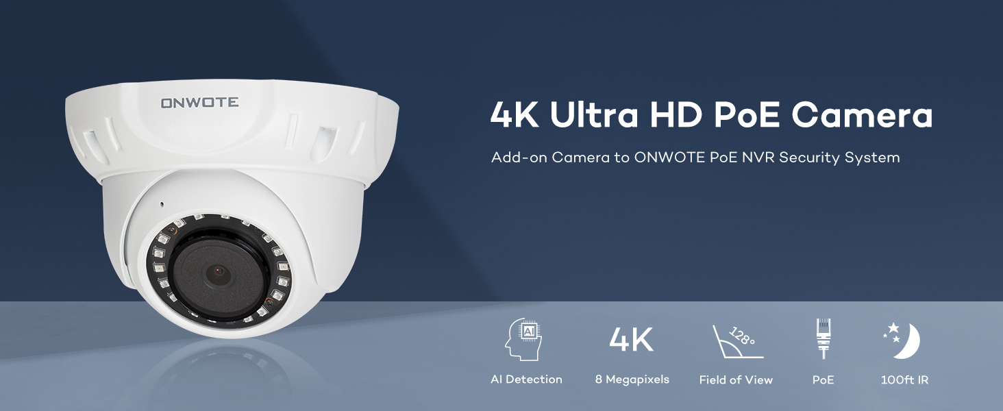 قبة كاميرا أمان ONWOTE UltraHD 4K 8MP PoE، كشف المركبات البشرية AI، 3840x2160 8 ميجابكسل، مجال رؤية 128 درجة، داخلي خارجي، صوت فيديو، 100 قدم IR، إضافة على الكاميرا إلى نظام PoE NVR