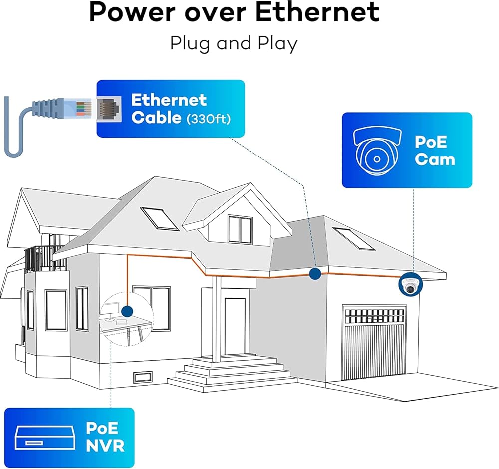 【الطاقة عبر إيثرنت، التوصيل والتشغيل】- يوفر كابل شبكة واحد كلاً من الطاقة ونقل الفيديو والصوت، مما يسمح بوضع الكاميرات في أي مكان بدون منفذ طاقة قريب.