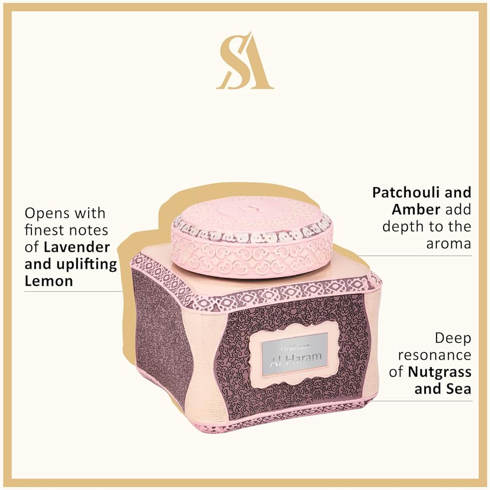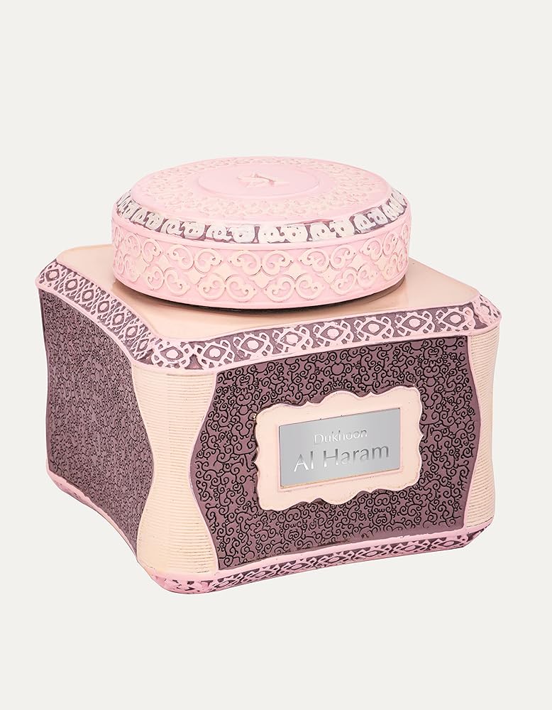 بخور دخون الحرم هو ضوء الشمس المتلألئ على مياه بحيرة زرقاء ساحلية شفافة. حيث يبدأ هذا العطر المنعش بطبقات عطرية عليا لاذعة من الليمون واللافندر، بينما ينتلئ القلب بطبقات العطر البحرية، وينتهي بطبقات من الخشب والعنبر في القاعدة. غني بالمكونات الغريبة مثل المريمية والبرالين والبلسم وخشب الورد والباتشولي والكلامنسي، بخور دخون الحرم يملأ منزلك وقلبك بموجة من البهجة.