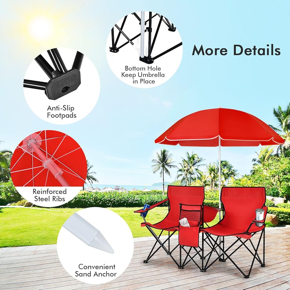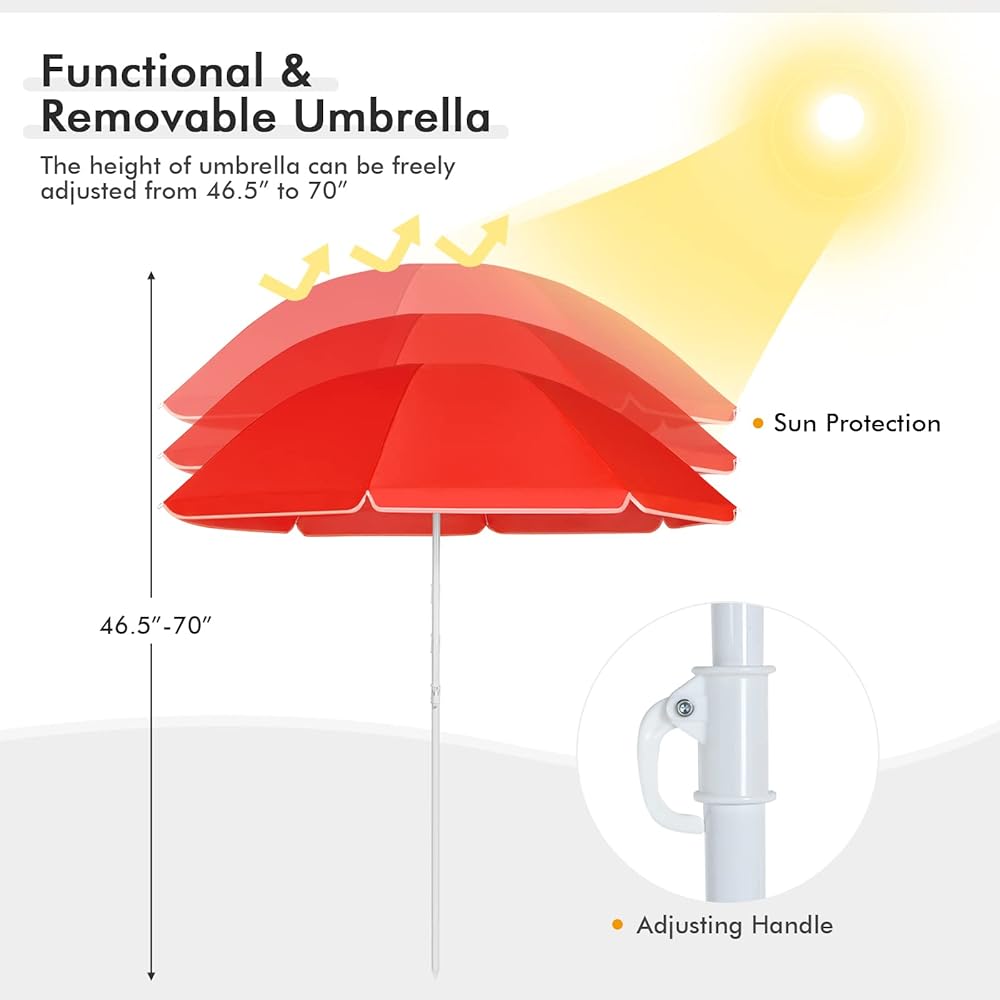 مظلة قابلة للفصل: تسمح لك المظلة القابلة للإزالة بالراحة على الكراسي حتى تحت أشعة الشمس المفرطة أو الرذاذ. بالإضافة إلى ذلك، يمكن تعديل ارتفاع المظلة من 46.5 انش إلى 70 انش لتلبية احتياجاتك المختلفة. وبفضل المرساة الرملية المريحة، من السهل عليك وضع المظلة.