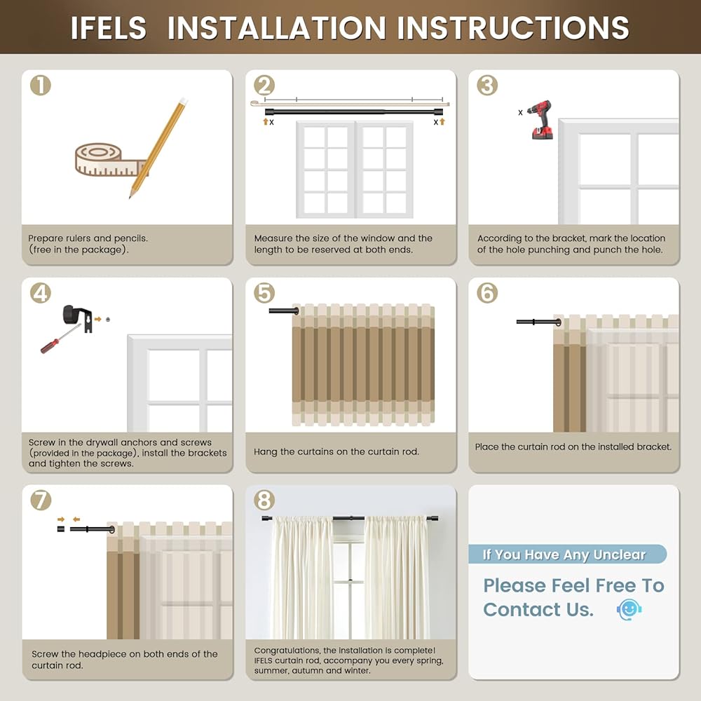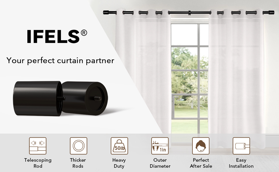 • [VERY EASY TO INSTALL] IFELS window curtain rod comes with installation instructions, hardware, soft ruler and pencil. Even if you've never installed a curtain rods before, you're sure to install it easily. Who doesn't love a modern curtain rod that is sturdy, beautiful and easy to install Use IFELS classic black curtain rods to match your beautiful curtains, Let your family feel at home more warm and more beautiful !