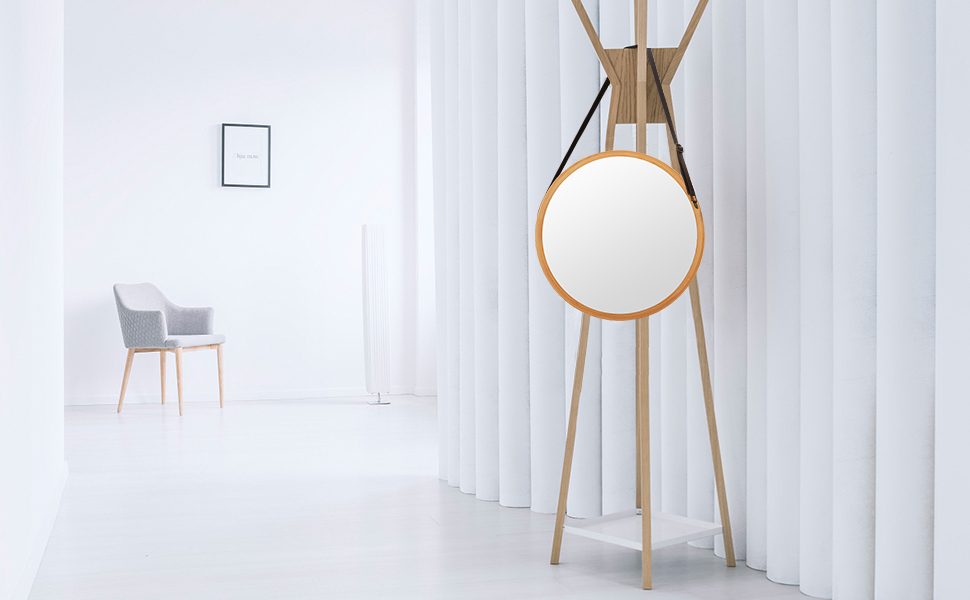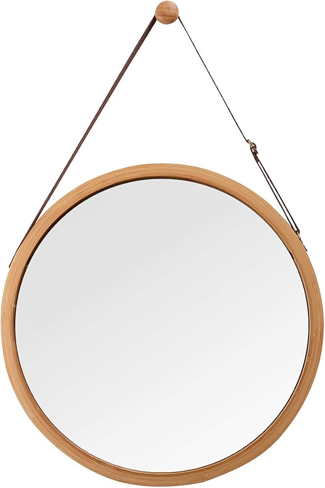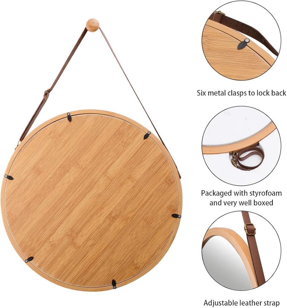 - حزام الجلد الصناعي للمرآة الدائرية قابل للتعديل، ومريح لضبط المرآة على مستوى مناسب لأي شخص. إطار الخيزران السميك والصلب لا يتشوه أو يتشكل