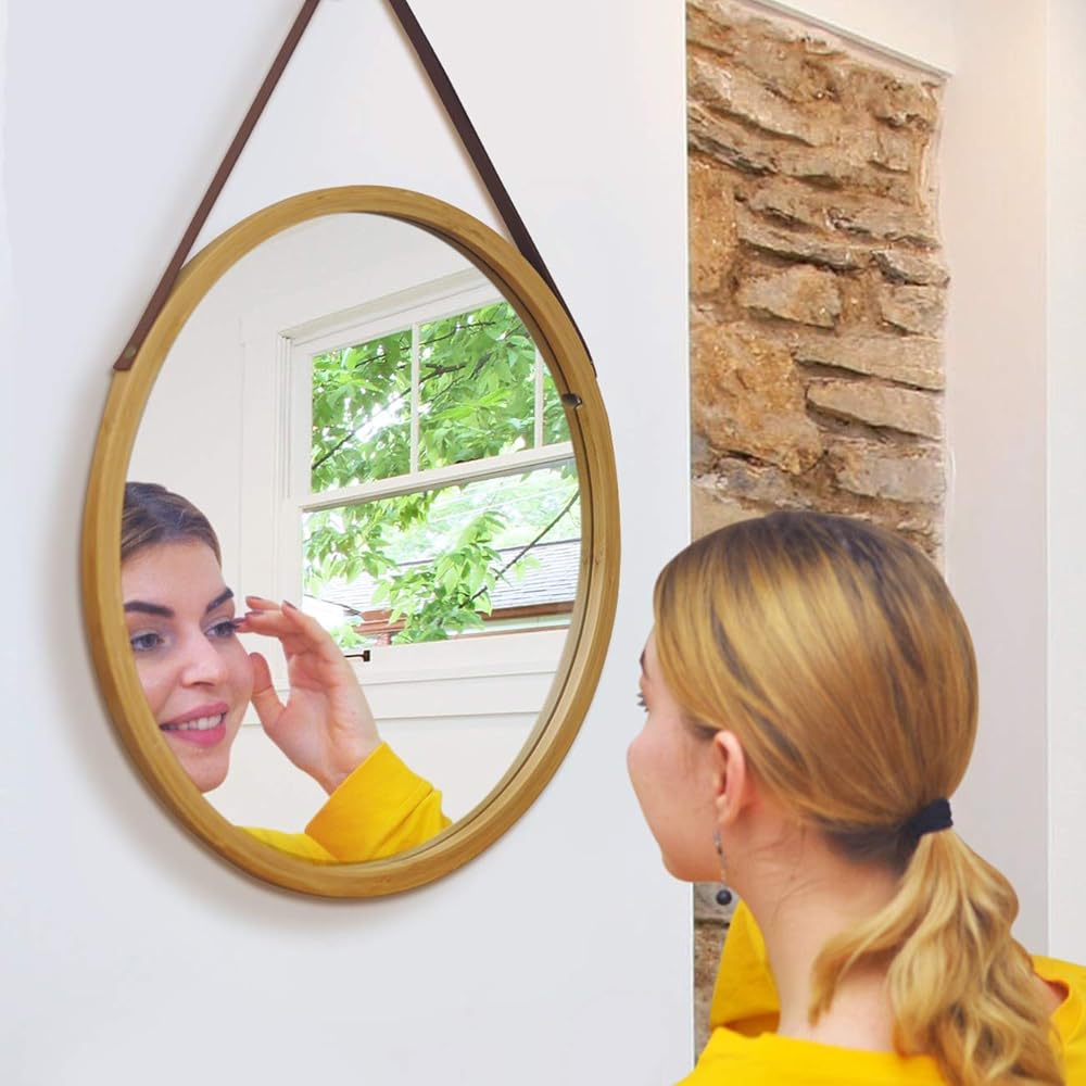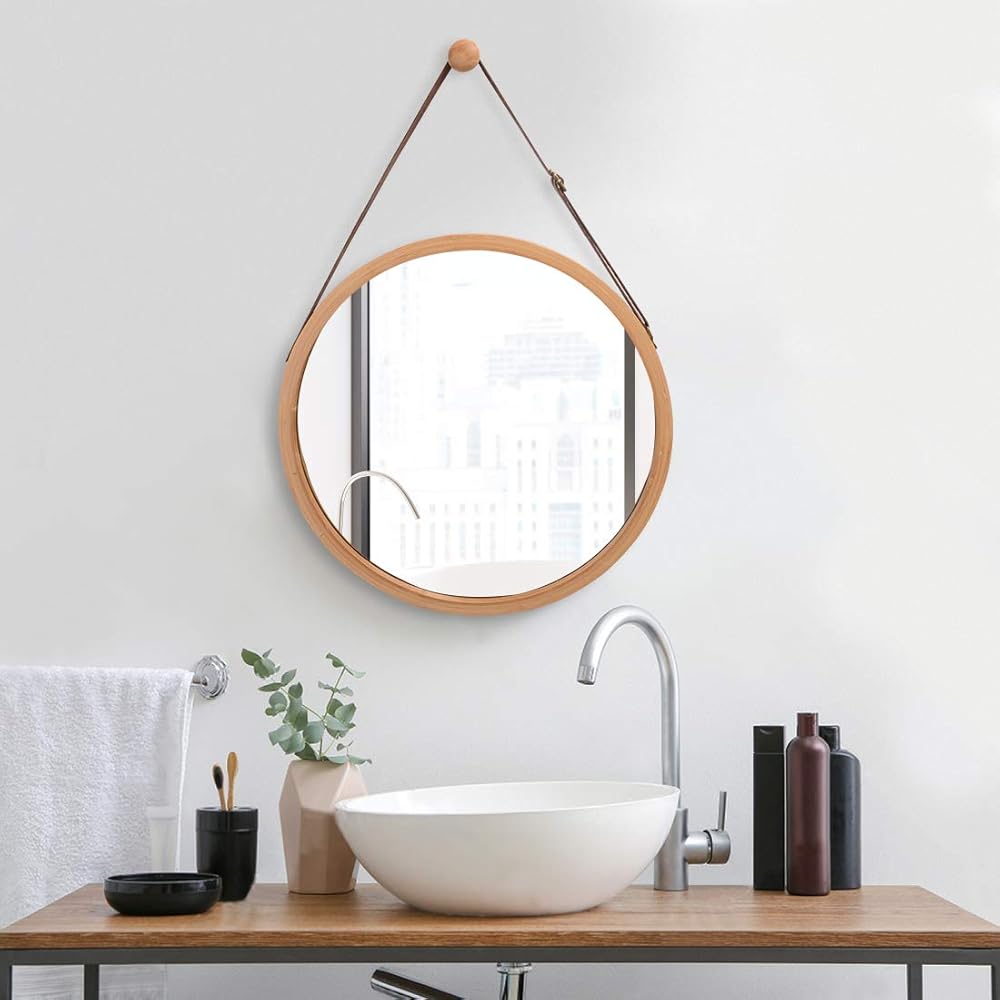 مرآة حائط دائرية معلقة في الحمام وغرفة النوم - إطار من الخيزران الصلب وحزام جلدي قابل للتعديل، ديكور منزلي لتزيين المكياج (الخيزران الطبيعي، 15 بوصة)