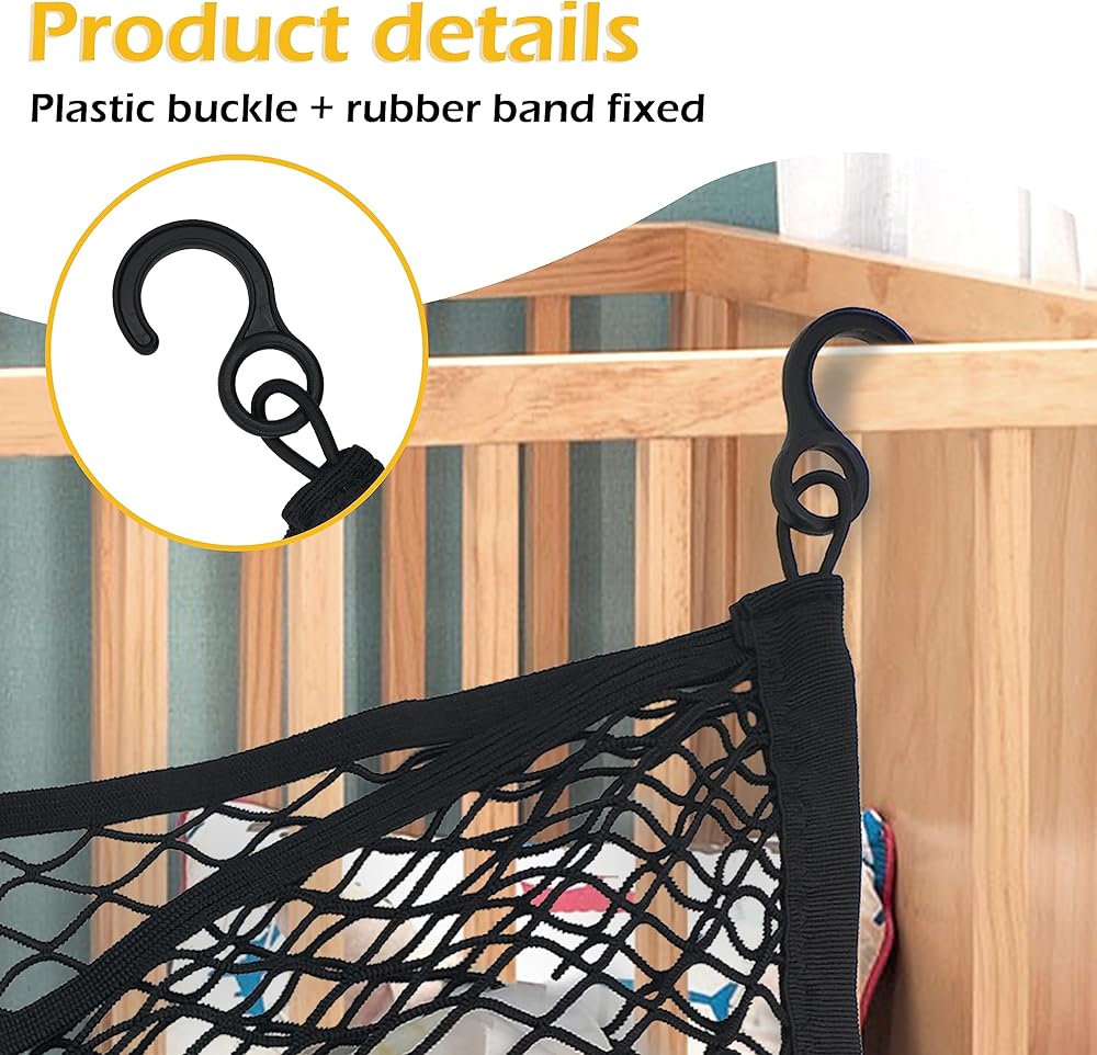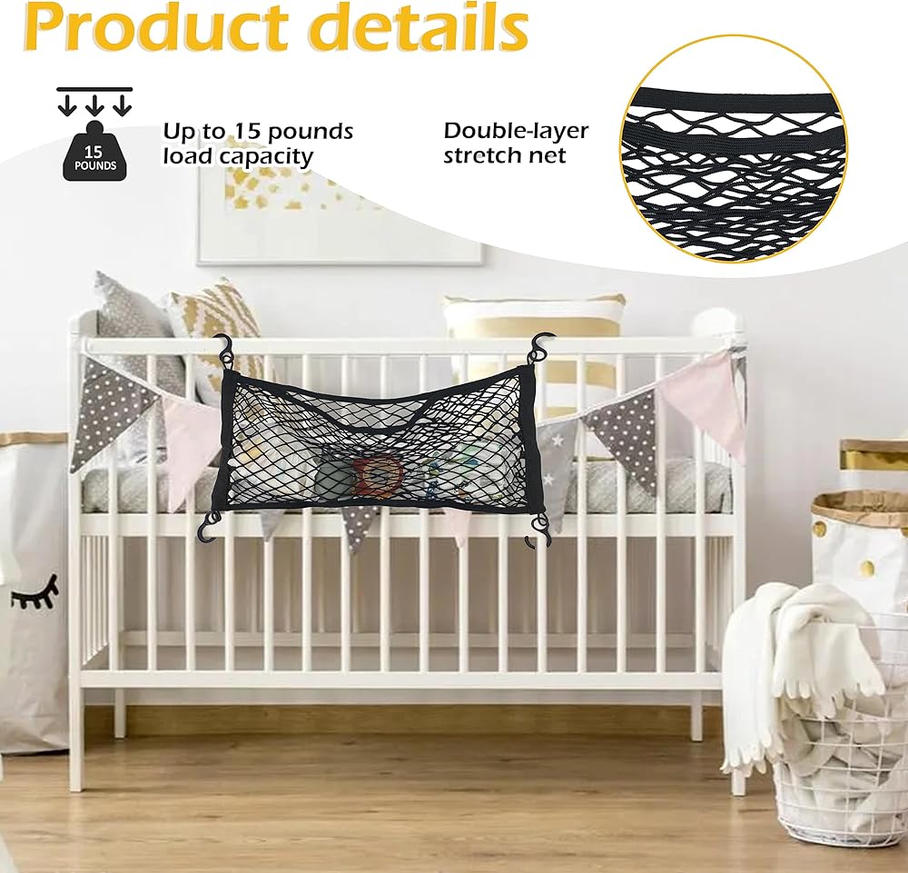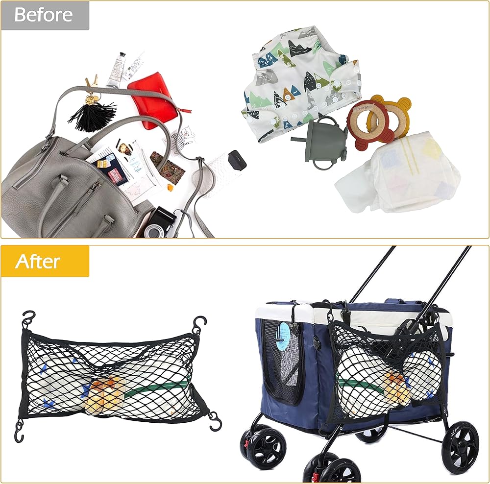 EASY TO INSTALL: The stretchable and collapsible mesh cargo net can be very simply attached to the carriage frame using the 4 black hooks provided (hooks are not removable) and adjusted as needed, no additional tools are needed and it can be folded and put away when not in use. The net retractable can also be washed in the washing machine (please put it inside the laundry bag to clean), easy to maintain and keep clean.