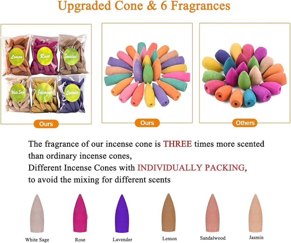 • 【المخاريط المطور والتعبئة الجديدة】من خلال أحدث تركيبة، يكون عطر مخروط البخور الخاص بنا أكثر بثلاث مرات من مخاريط البخور العادية، وتحسن الرائحة. بخور مخروطي مختلف مع عبوة فردية، لتجنب الخلط للروائح المختلفة. 150 مخروطًا من البخور المطور و60 عصا البخور، لا حاجة لشراء مخروط البخور إضافي أو عصي البخور. (مخروط متنوعة مع 6 عطور، تشمل المريمية البيضاء واللافندر والورد وخشب الرمل والليمون والياسمين).