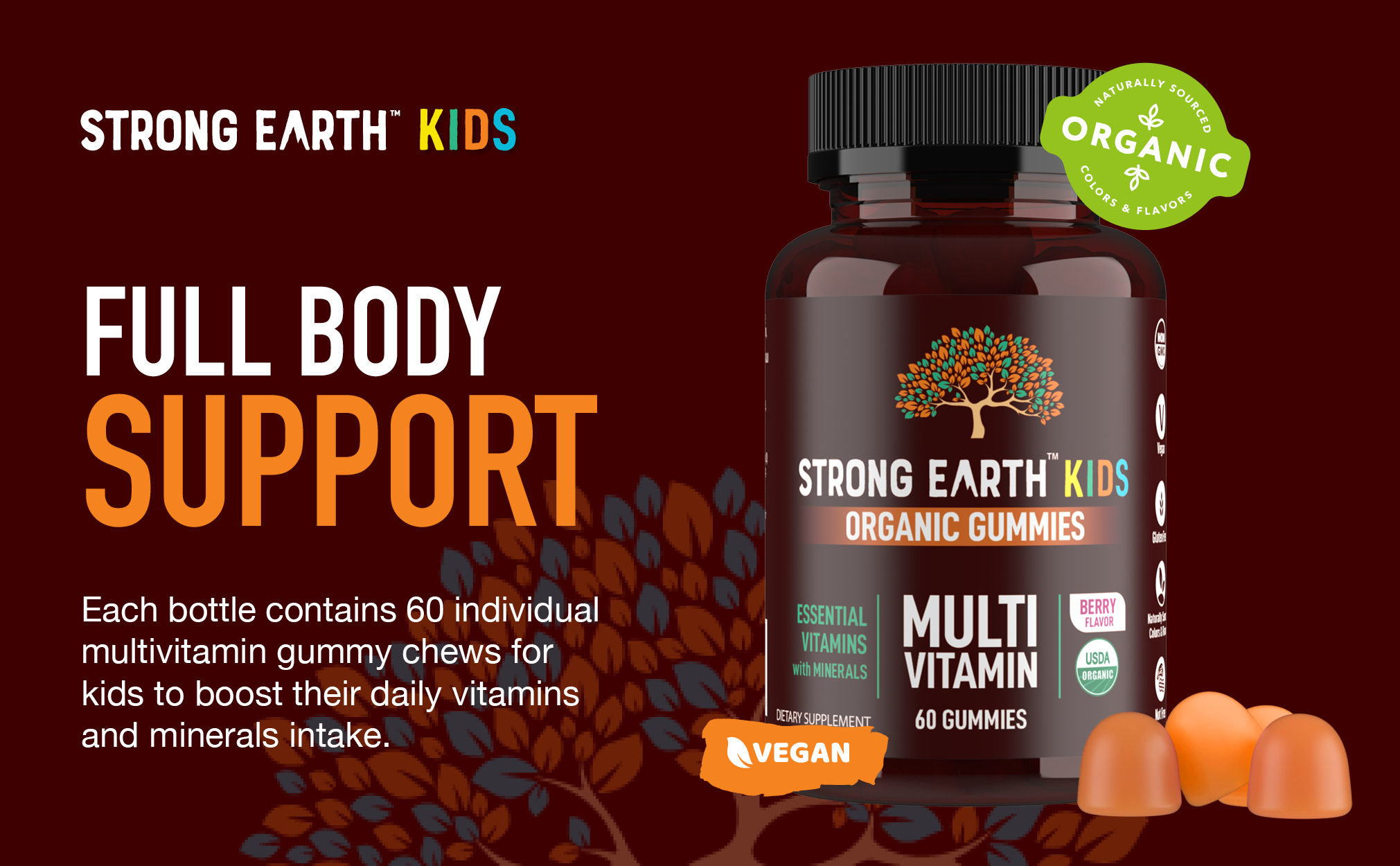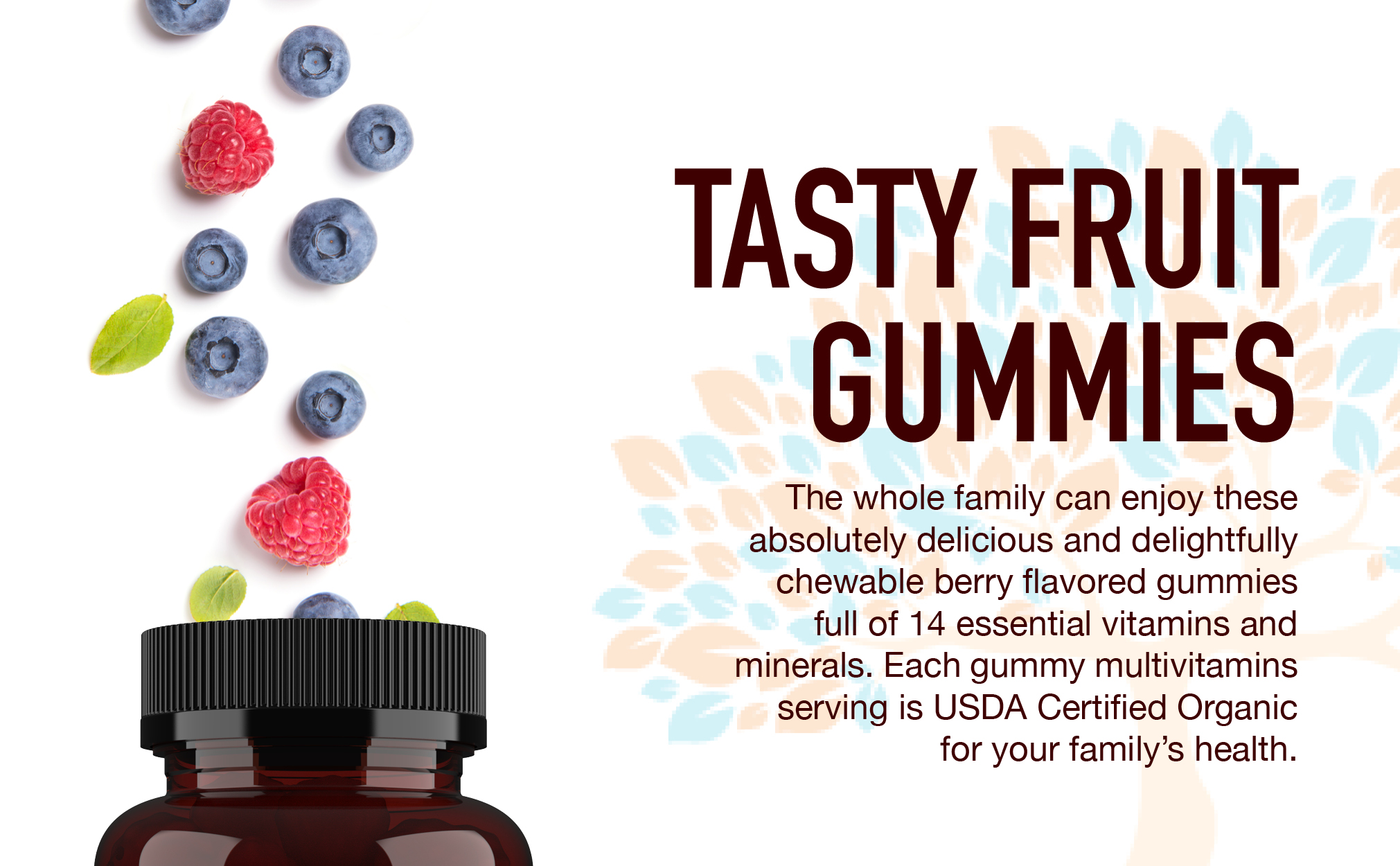 • نكهة التوت اللذيذة - يمكن لجميع أفراد العائلة الاستمتاع بهذه العلكات اللذيذة والقابلة للمضغ والممتلئة بـ 14 فيتامينًا ومعدنًا أساسيًا. كل حصة من الفيتامينات المتعددة الصمغية هي عضوية معتمدة من وزارة الزراعة الأمريكية من أجل صحة عائلتك.