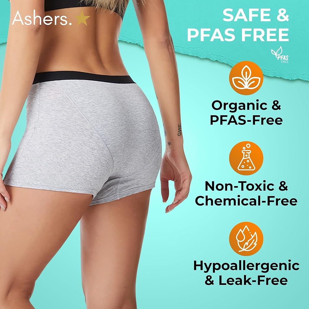 تصميم مستدام: احتضن مواد خالية من المواد الكيميائية والسموم التي تعطي الأولوية لرفاهيتك وثقتك. سراويل الدورة الشهرية الخاصة بنا لا تسبب الحساسية ومصنوعة بتصميم مستدام، يحترم جسمك والبيئة.
