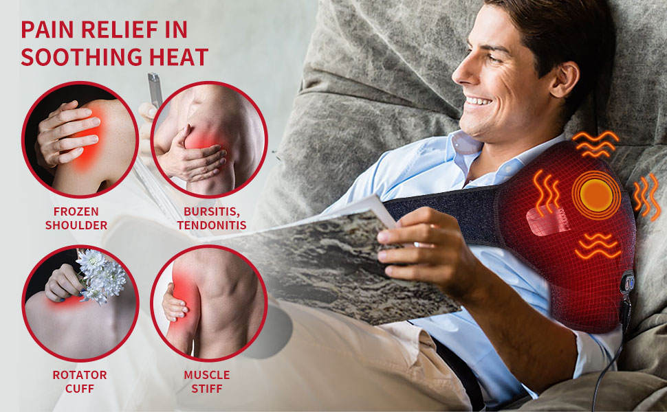 • تخفيف آلام الكتف: تسخن في ثوانٍ، توفر علاجًا مريحًا لكتفك وتدليك كتفيك بالاهتزاز وتعزيز الدورة الدموية وتخفيف الألم الناجم عن تجمد الكتف والكفة الدوارة الممزقة وخلع مفصل التيار المتردد والالتواء والتهاب الجراب والشلل والإجهاد والتصلب والألم. يمكنها إرخاء عضلات الكتف وتساعد على التعافي بسرعة أكبر