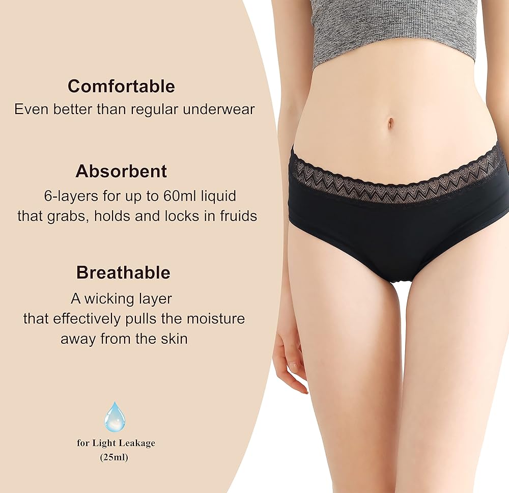 ABSORBENT & ODOR CONTROL: Our absorbent, quick-drying protection panties hold up to 25ML liquid — a solution for light bladder leakage. Features a soft, mosture-wicking core to keep you dry and comfortable. Odor Lock technology neutralizes odors instantly and continuously.