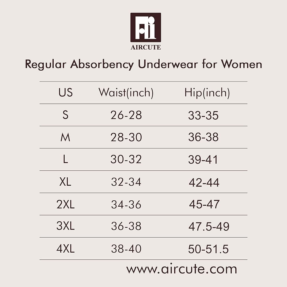 AIRCUTE Washable Incontinence Underwear Provides All-Day Comfort. Choose the right size from the 6 Available Waist Sizes(S: 26-28", M: 28-30", L: 30-32"; XL: 32-34"; 2XL: 34-36"; 3XL: 36-38"). We use INTERNATIONAL STANDARD SIZING (sizing chart is in the pictures section).