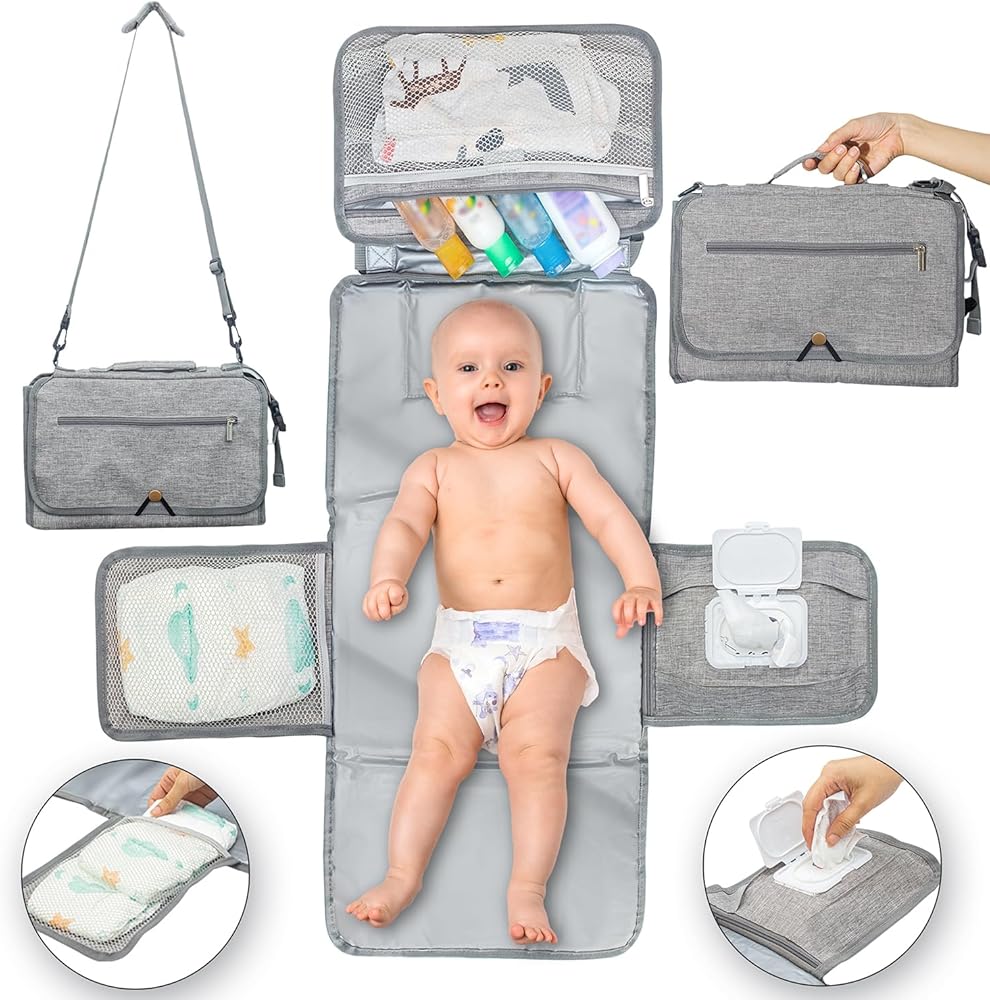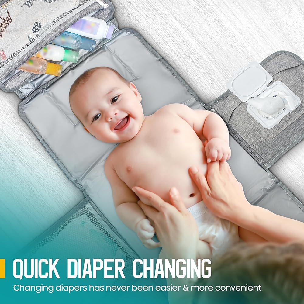 ✅ تخزين ذكي ➤ توفر وسادة تغيير حفاضات الأطفال هذه ذات السحابات المتعددة المحمولة مع جيوب ذكية ومقصورات شبكية مساحة لـ 3 حفاضات وكريمات وأساسيات وما يصل إلى 100 منديل. حافظ على كل شيء منظمًا في متناول اليد.