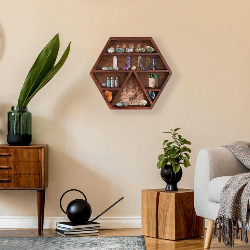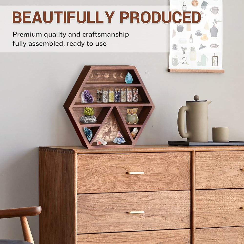 • 🌙ديكور حائط على شكل سداسي: يتميز رف القمر الخشبي الأسود هذا بشكل سداسي كلاسيكي وخمسة أرفف لعرض البلورات أو أحجار الشفاء أو تمثال صغير أو المقتنيات الأخرى. يشتمل رف الحامل الكريستالي أيضًا على لافتة مزخرفة على شكل ذئب وقمر، والتي ستضيف حضورًا مهدئًا وساحرًا إلى أي غرفة.