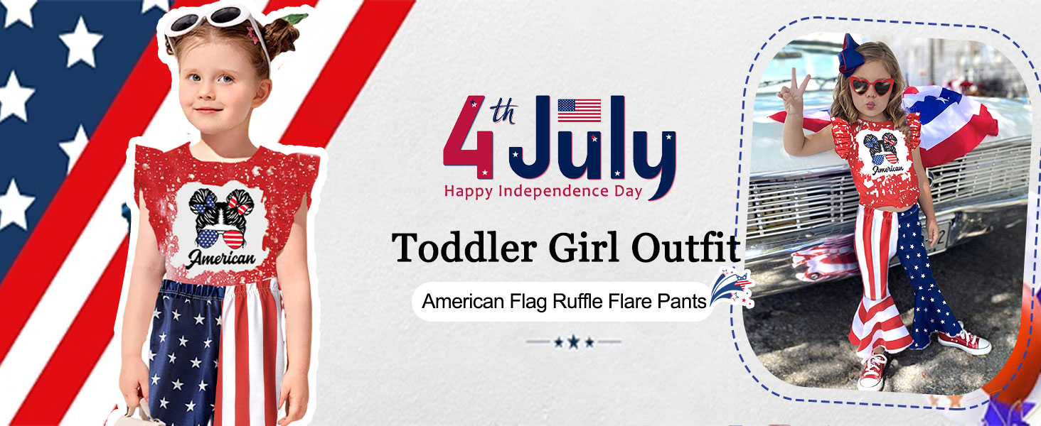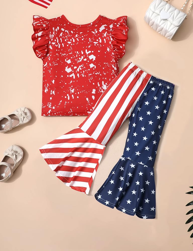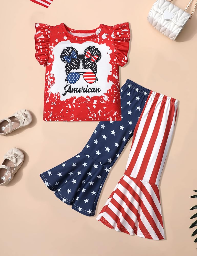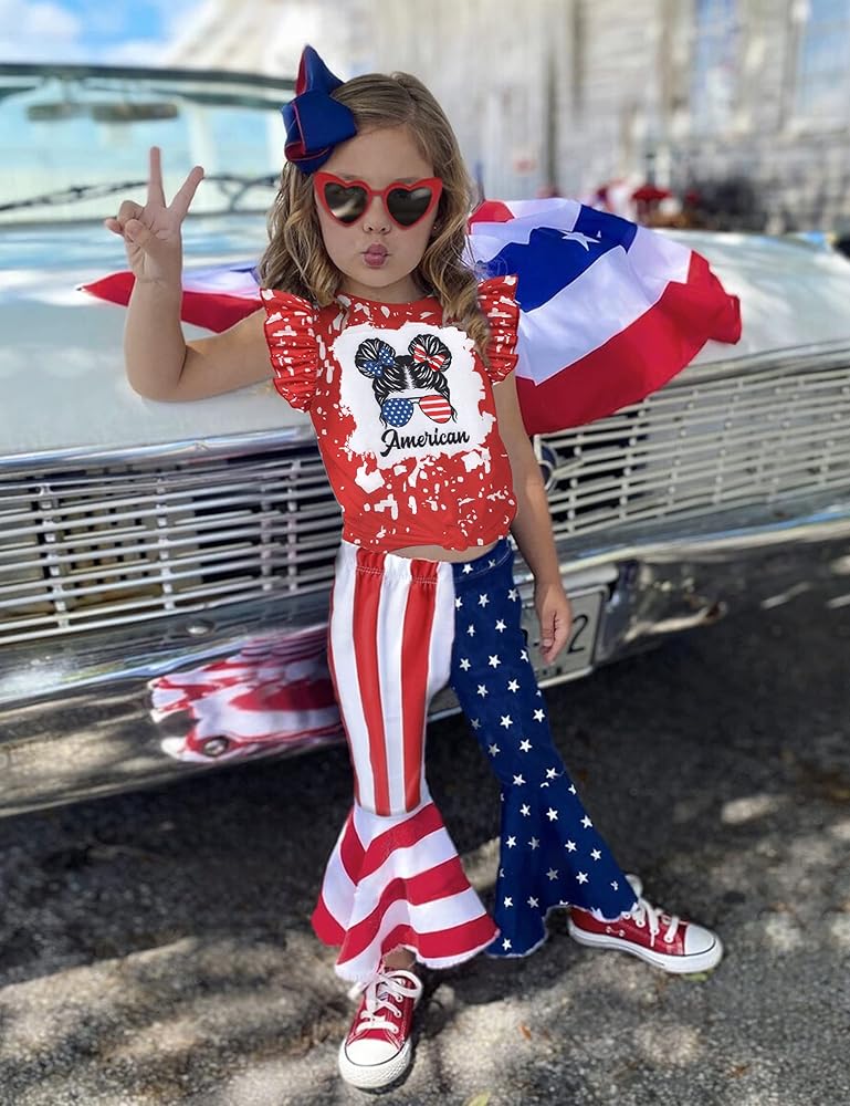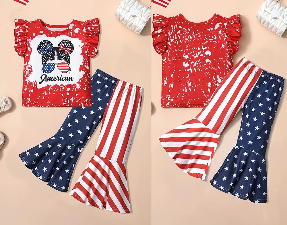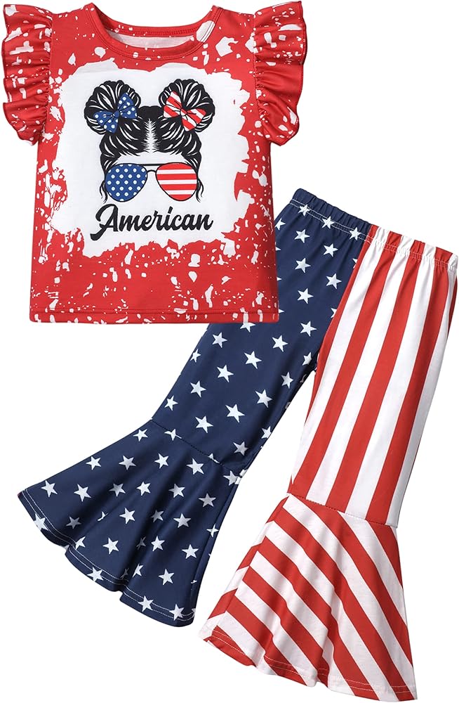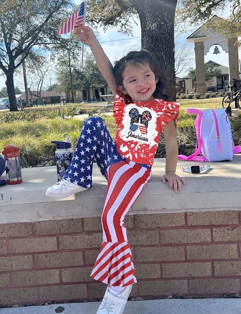 💝🗽العبوة: 1 × تي شيرت للفتيات الصغيرات + 1 × بنطال ذو جرس واسع. ملابس صيفية أنيقة ولطيفة مكونة من قطعتين، أفضل هدية لطفلتك الصغيرة في هذا الصيف، يجب أن تحبها! مثالية أيضًا كهدية في الرابع من يوليو لابنتك أو حفيدتك.