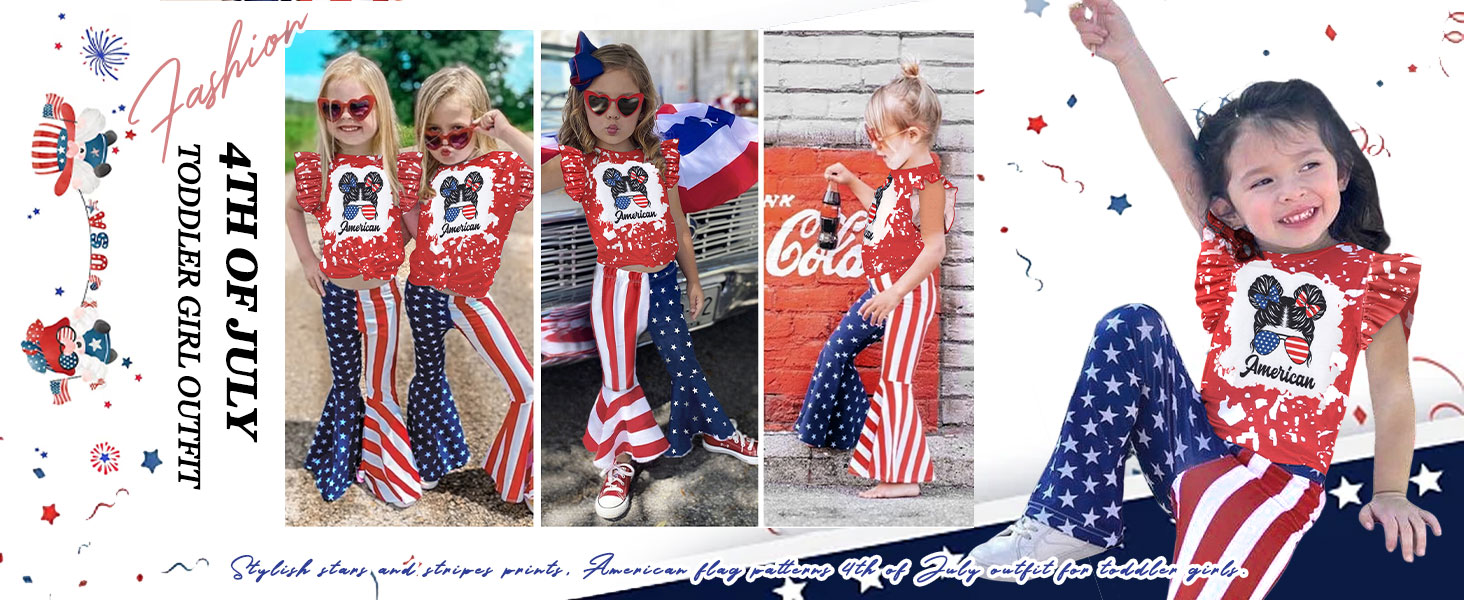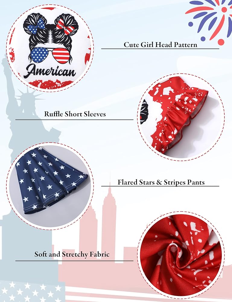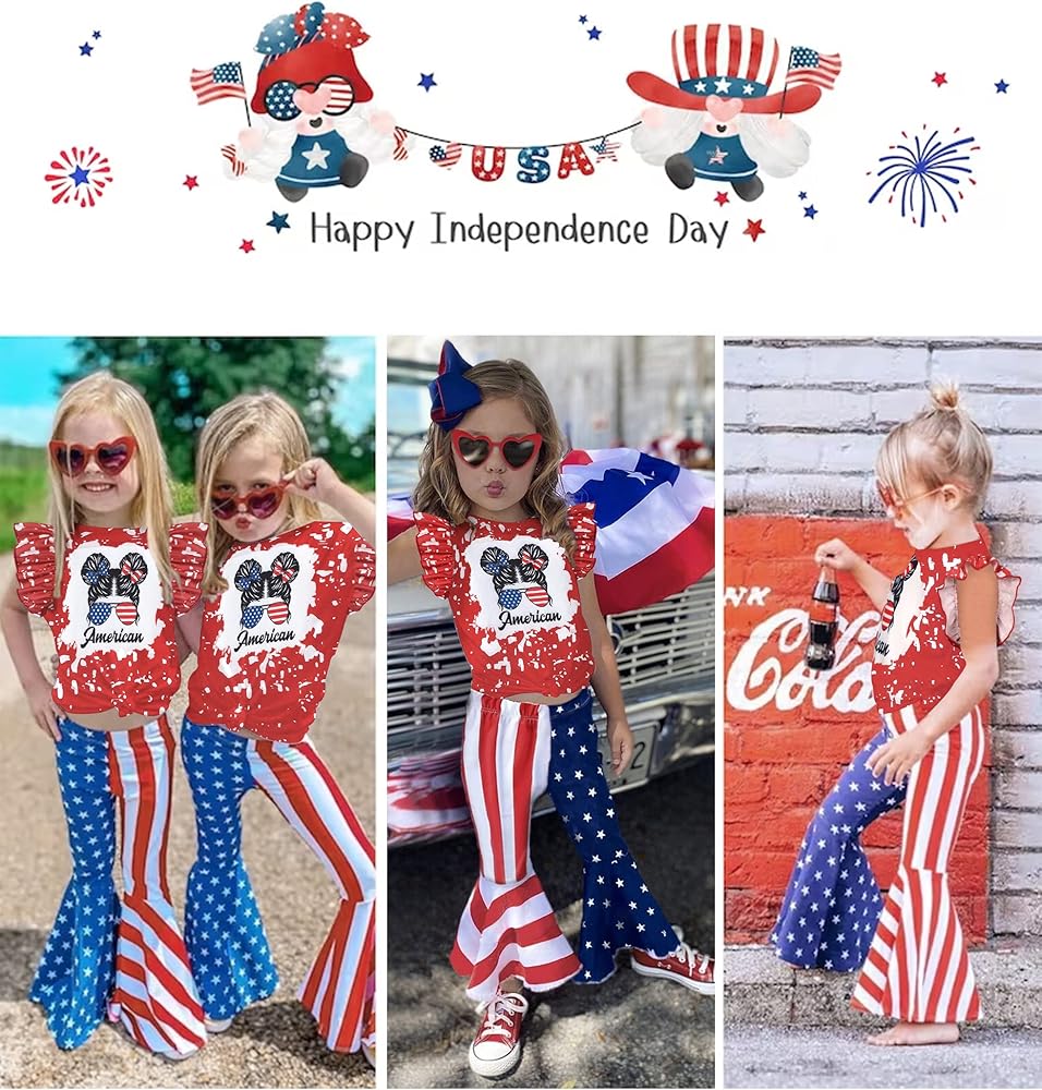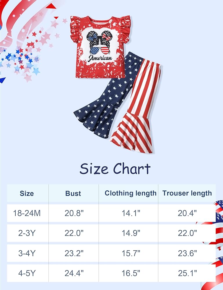 💝🗽المادة: زي الفتيات الصغيرات هذا في الرابع من يوليو مصنوع من البوليستر. المقاس أنيق والنسيج ناعم ومريح، وملمس قابل للتمدد ورائع، تي شيرت بأكمام قصيرة بعلم أمريكا + سروال واسع مخطط بنجوم على شكل جرس، ملابس لطيفة للفتيات الصغيرات في الرابع من يوليو، مثالية لفصل الصيف.