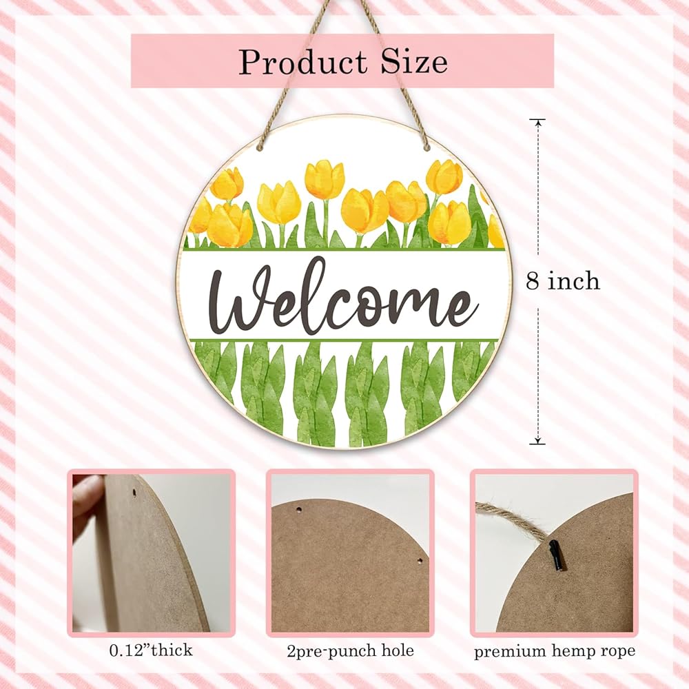 What you get - You will get 1 piece packaged round wooden sign with a preuim jute rope, the size of each sign is 8 x 8 inches, 0.1 inches thick. Use this spring wood hanging sign as a gift for graduation, housewarming, retirement, birthday, Easter, anniversary, New Year to express your blessings to them.