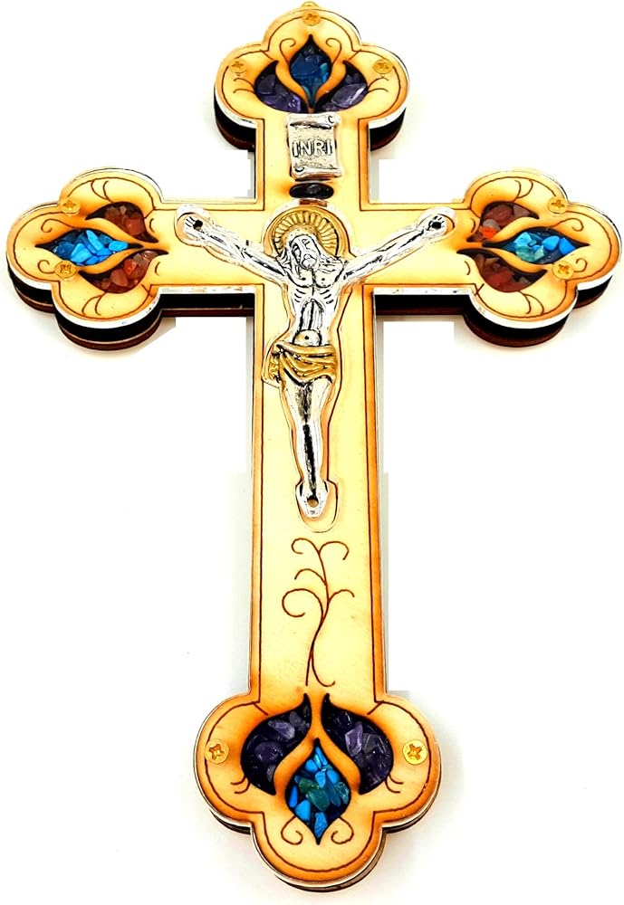 This beautiful Wall Cross with Catholic Crucifix made from wood and decorated with colorful semi-precious stones and amazing floral ornament. The crucifix and letters INRI (Iesous o Nazoraios o Basileus ton Ioudaion - Greek: Jesus of Nazareth King of the Jews) are made from pewter. Handcrafted from wood, and decorated with semi-precious stones. Blessed in the Holy Sepulcher Church, Jerusalem. PIECE OF THE HOLY LAND IN YOUR HOME!!! GOD BLESS YOUR HOME! Ready for wall hanging. Dimensions: Height 20 cm / 7 inch, Width 13 cm / 5 inch. Makes a great religious gift for your loved ones, friends or family for a Housewarming, Christmas, Easter, Baptism, Birthday, and any special occasion.