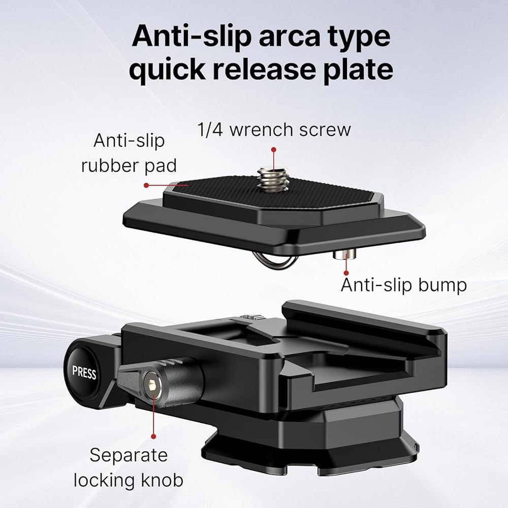 【Arca Quick Release Plate】the quick release mount fits Arca plate, help you quick release in a second. The independent locking knob and Anti-slip bump will increase safty largely