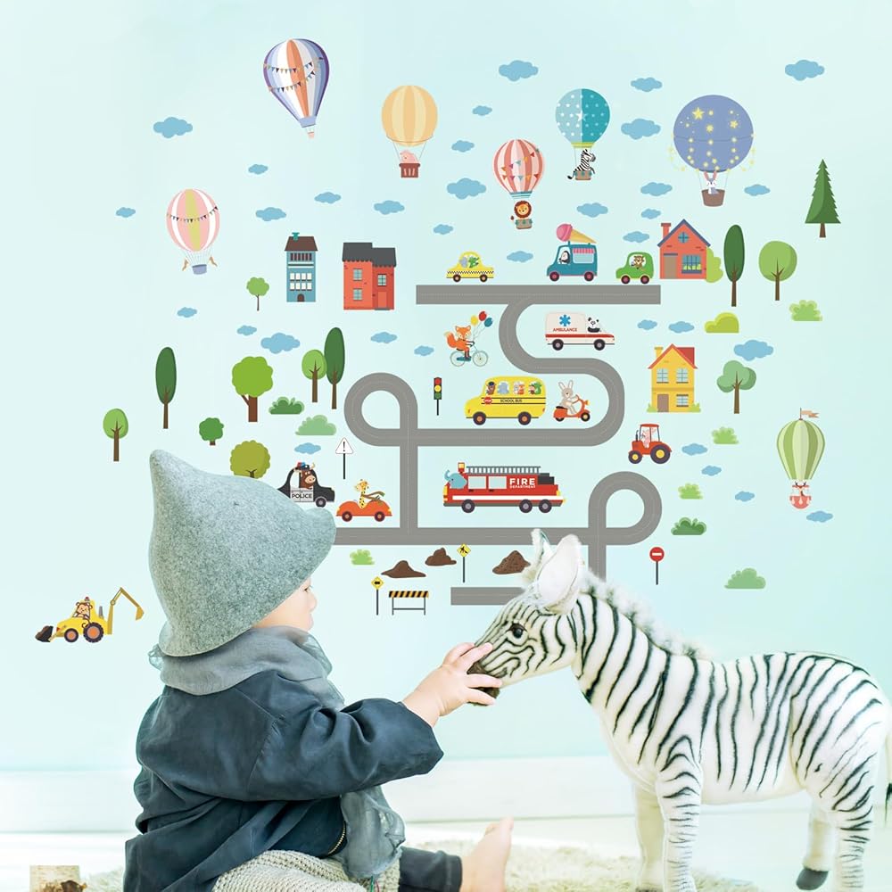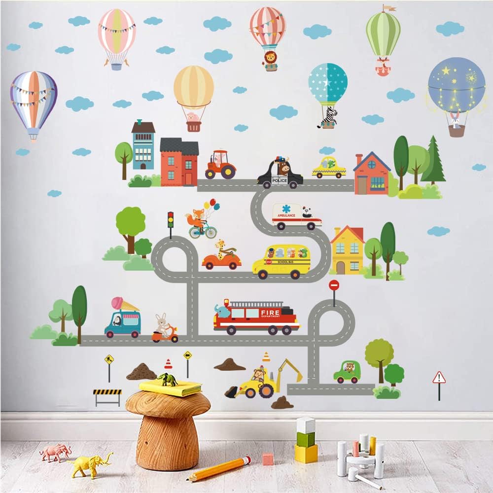ملصقات حائط Supzone Car Road Road ملصق حائط لوسائل النقل في المدينة ملصق حائط لمركبات منطاد الهواء الساخن للأطفال الأولاد والرضع وغرفة النوم وغرفة اللعب وغرفة المعيشة وديكور الحائط